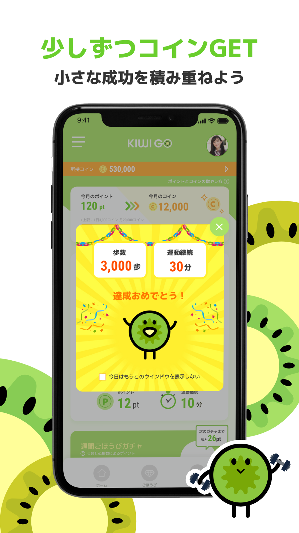 KIWIチャンと一緒なら、ポイントGETのたびにめいっぱいほめてくれます。
