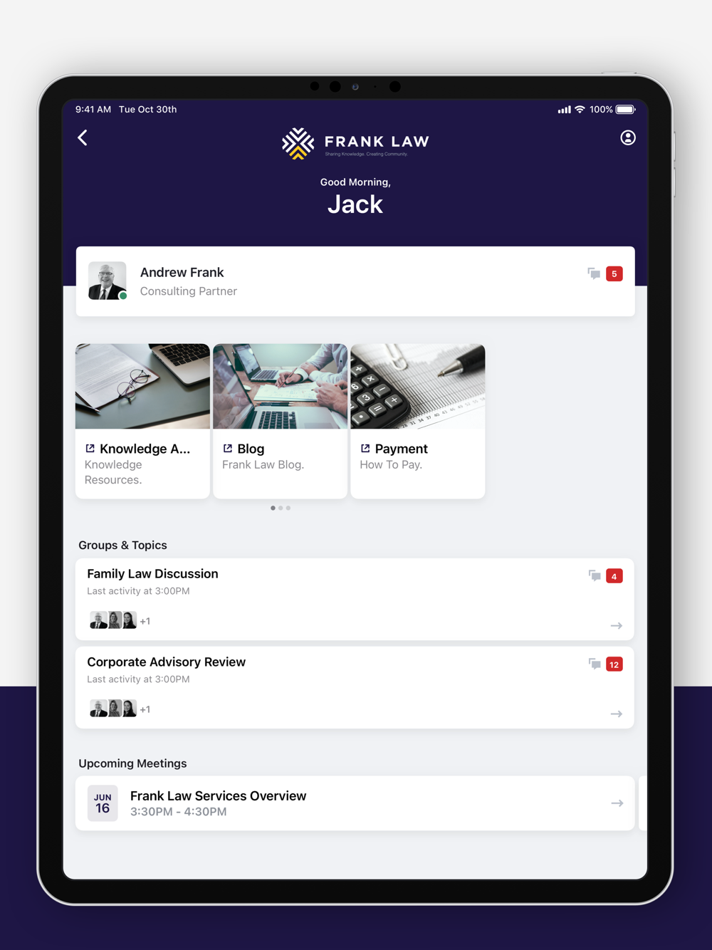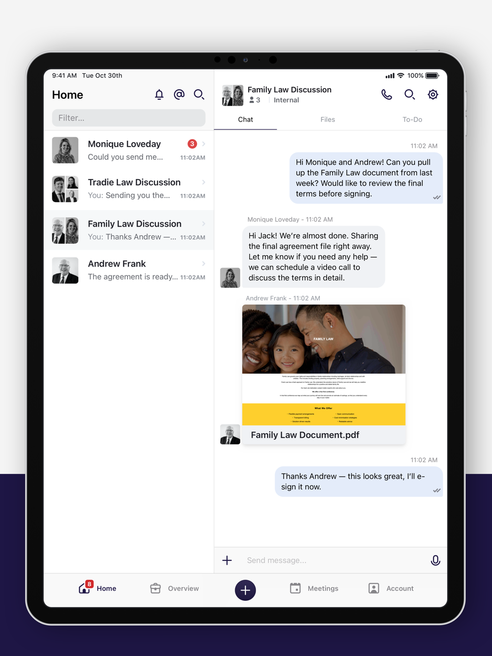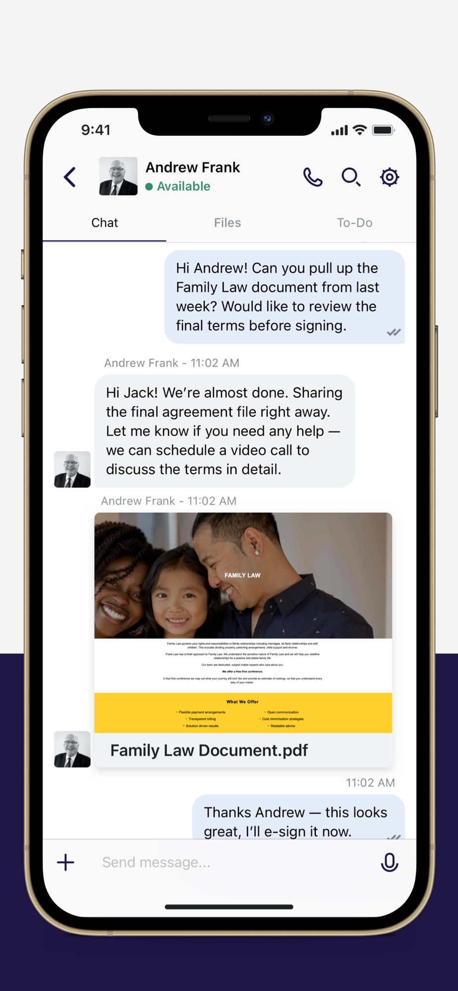 Use our app to connect with our team via text, voice, and video messaging and video conferencing. With capabilities such as digital signature, live document annotation, and on-demand access to our firm via mobile and web, our app provides you with a legal service experience at your fingertips.