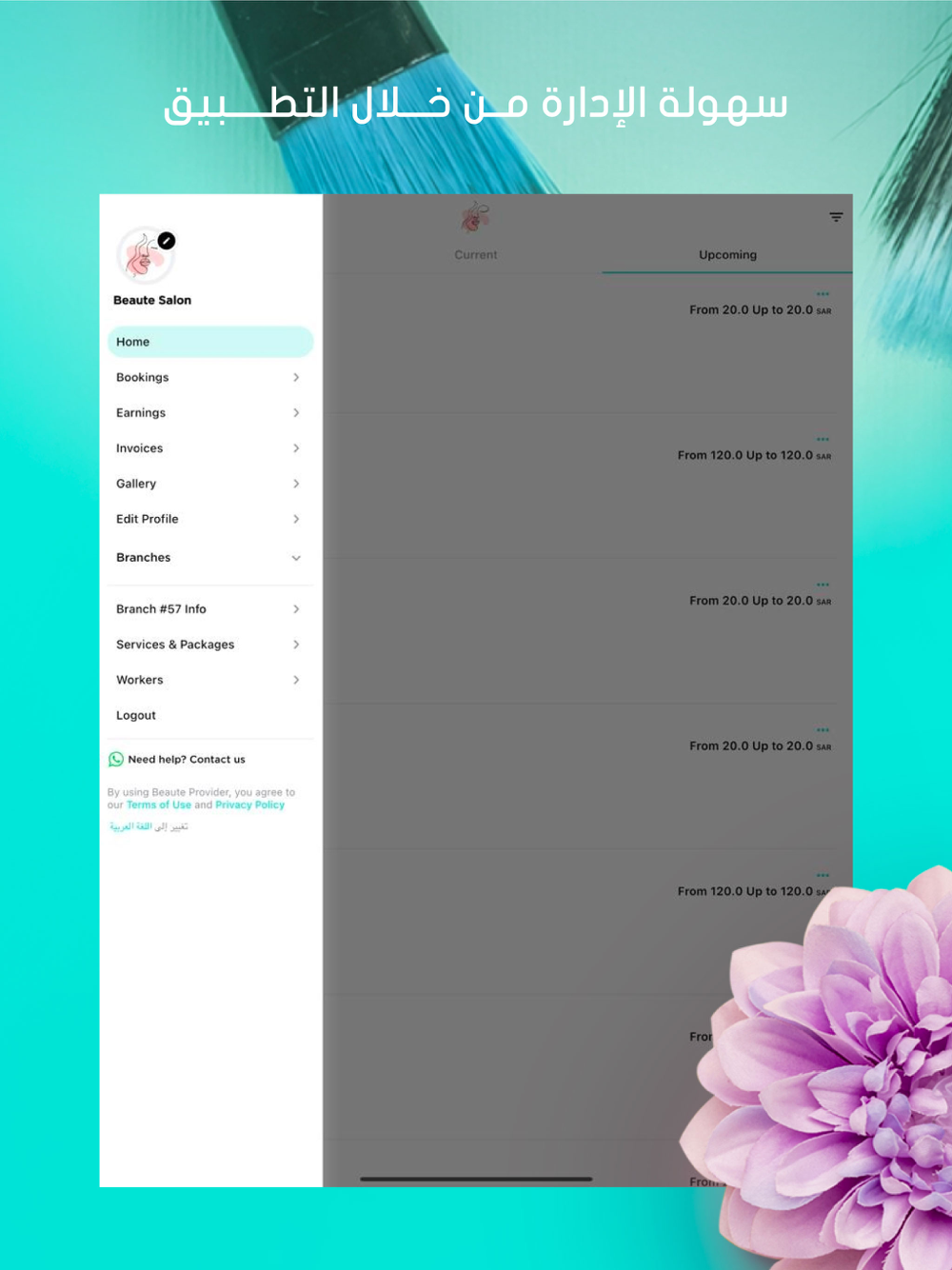 Beaute Provider is an application for Beauty Salons and home services bookings. You can reach more customers around your city, manage your bookings, and analyze your earnings. Beaute Provider App presents a convenient way to establish different branches of your salon, define your own services, and track your bookings and workers. Our support team is looking to serve you all the time of day. In addition, you can upload gallery photos to attract more customers and help people recognize your salon. Beaute Provider App is friendly to use, transparent, and offers an amazing experience.
