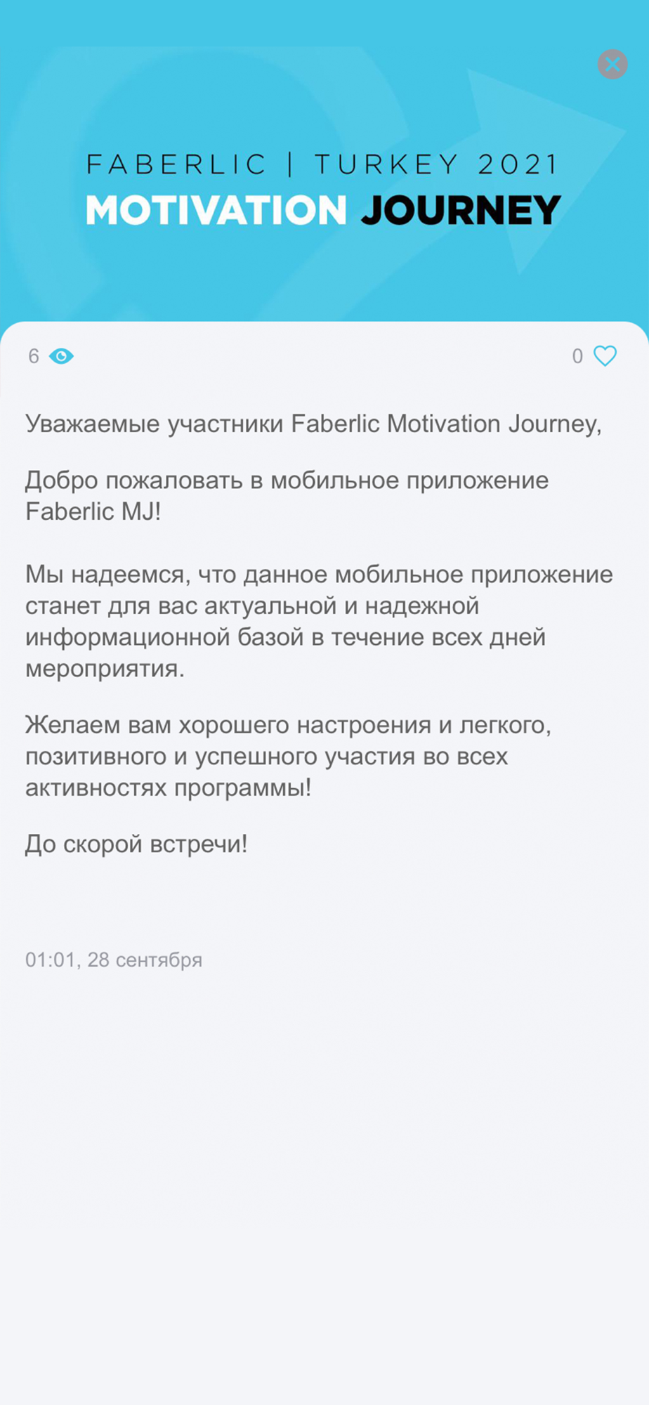 Бесплатное мобильное приложение разработано специально для участников Мотивационной поездки Faberlic в Турцию. Здесь вы найдете всю важную информацию о поездке: проживание, расписание, программа, обратная связь с организаторами, фотографии и многое другое.