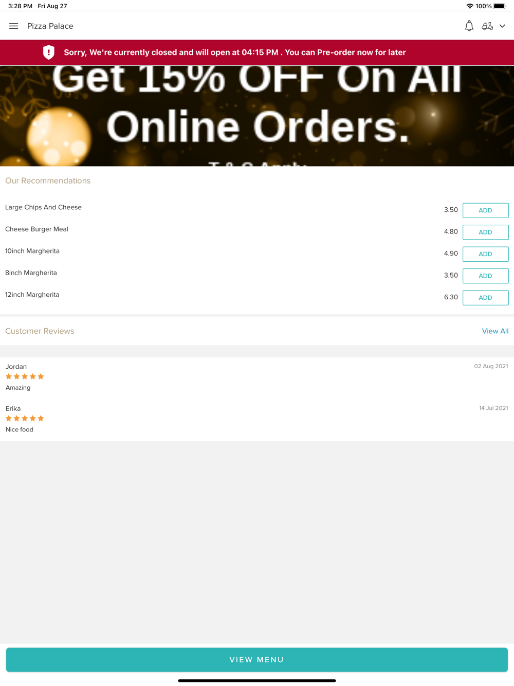 Here at Pizza Palace, we are constantly striving to improve our service and quality in order to give our customers the very best experience. As a result, we are finally proud to unveil and introduce our latest improvement, our new online ordering app! You can now relax at home and order your favourite, freshly prepared meals from Pizza Palace in Derby. You can even pay online!
