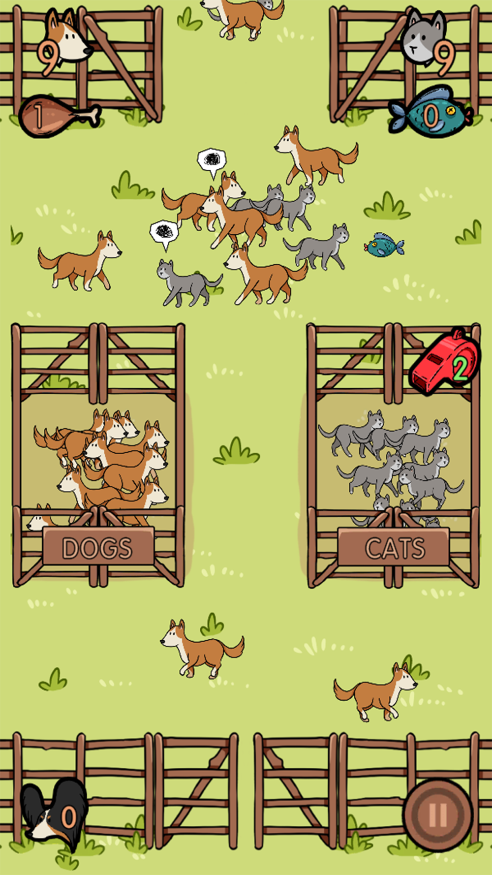 It's raining dogs and cats at the daycare! Touch, drag, and drop the dogs in the dogs pen and the cats in the cats pen, but be careful not to place the wrong animal on the wrong pen - a fight might break out! Feed the animals some food to calm them down. Make sure to act quick - if any are left injured, the game will end!