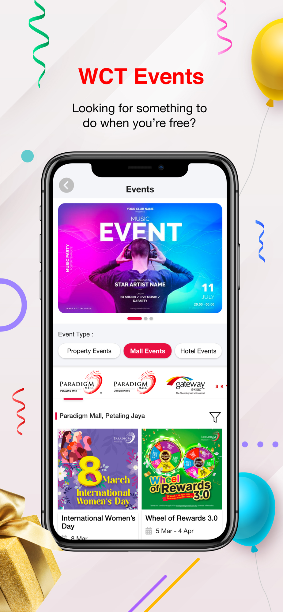 • Be rewarded every time you use your app at WCT Properties & WCT Malls.