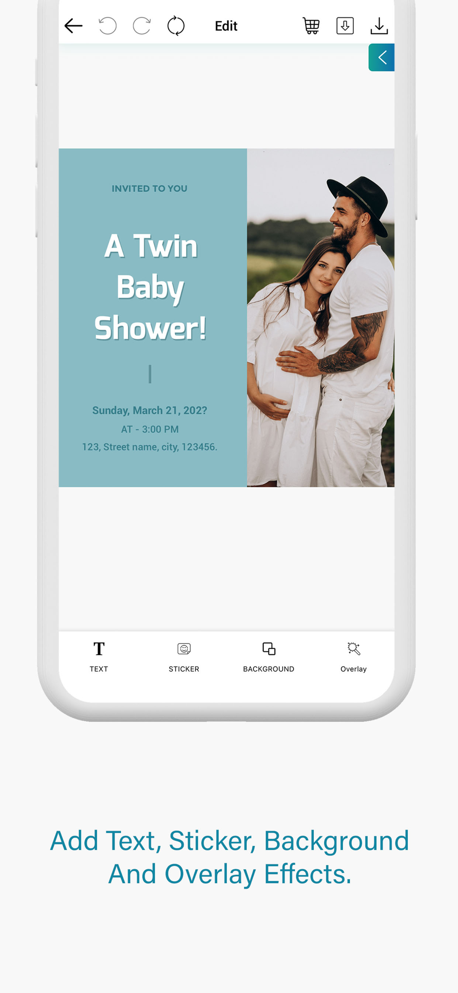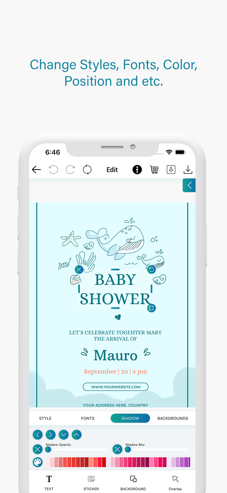 Text Editing : Using invitation Card Maker app user can edit text, change color, font, apply shadow effect, move around the area and etc.