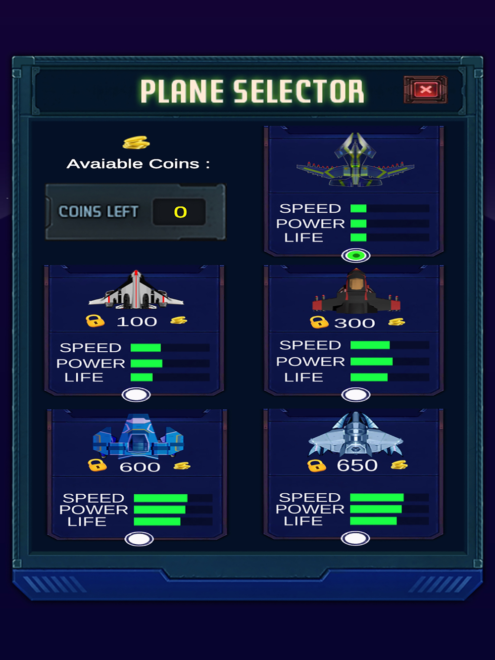 Your goal is to destroy all enemies spacecraft. As the game progresses, you will encounter more powerful enemies, so you need to upgrade your spaceship to gain new powers. The game has many levels of game-play with different difficulty levels, along with many battle bosses. For each level you finish you will get 50 coins, use the collected coins to unlock more powerful spacecraft.