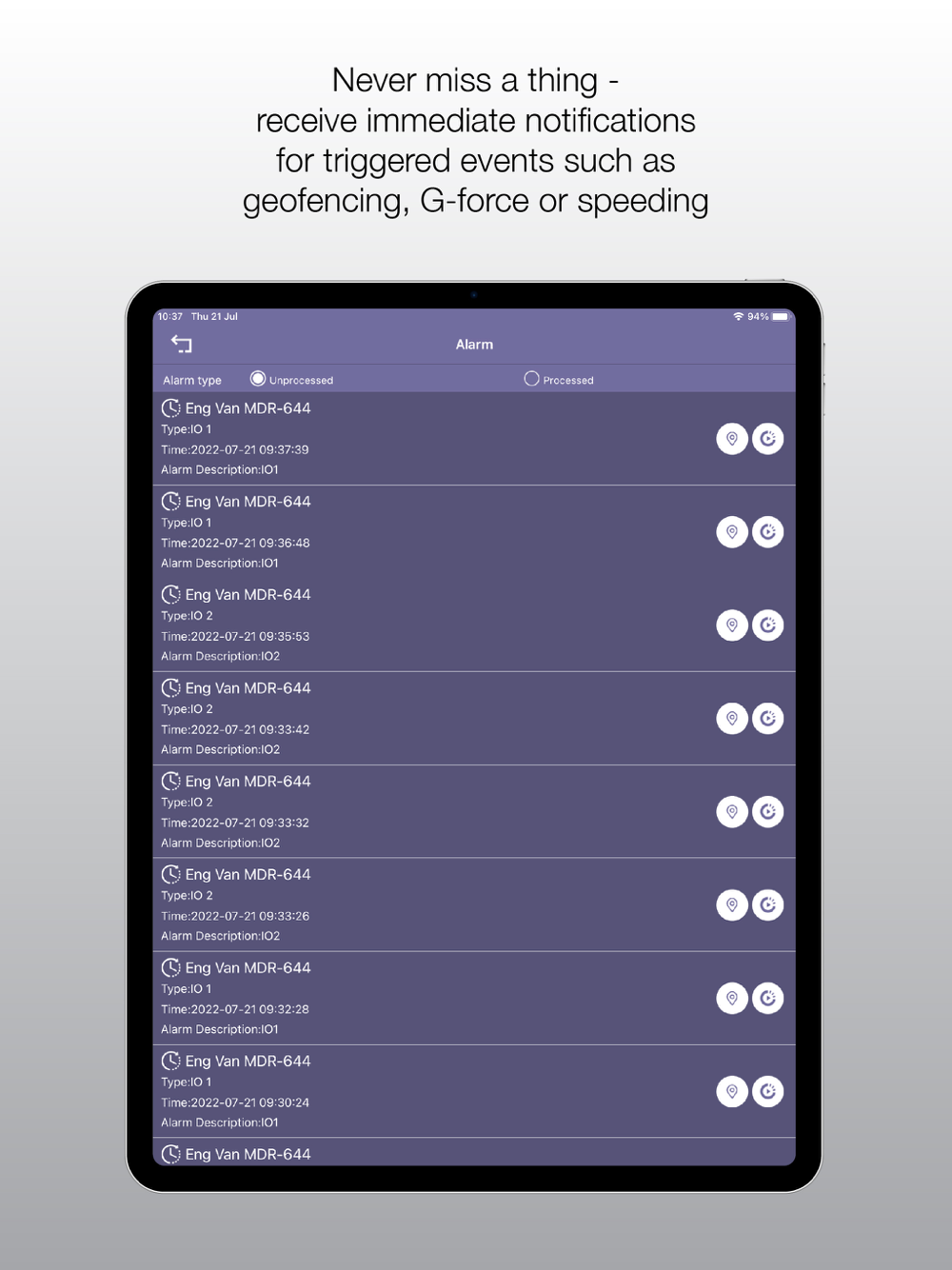 - Immediate push notifications of triggered alarms such as geo-fencing, G-