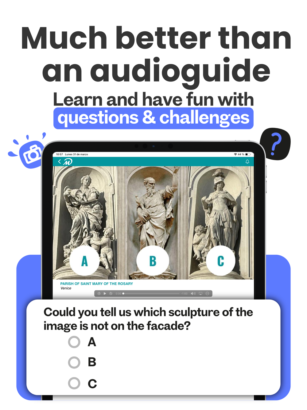 Visit each destination, just like a real local would, thanks to our recommendations and interactive routes: audio guides, guided tours, games, gamification and all the essential information for your next destination.