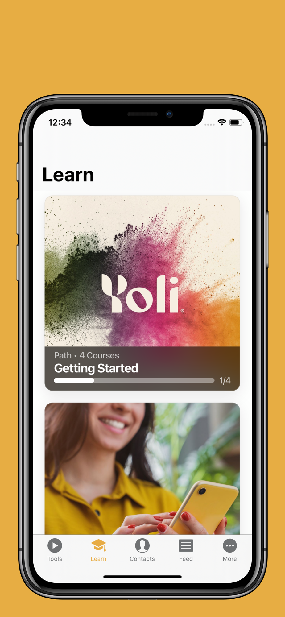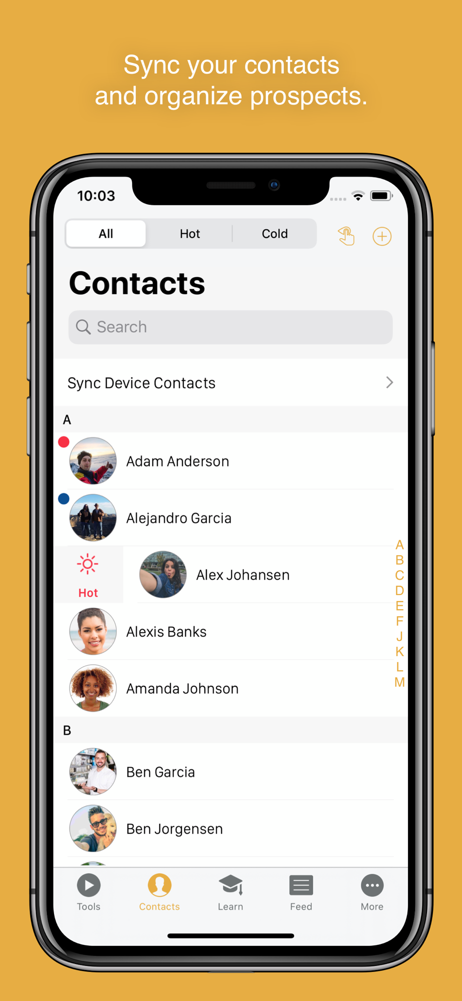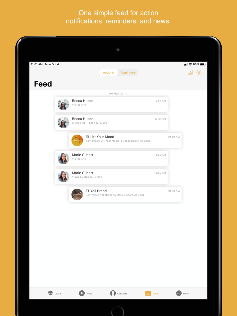 Contacts: Choose how to sync and manage your contacts. Swipe to sort them by interest level. You can make connections, add notes, or check out the Contact Feed to see the tools you’ve shared and contact actions.