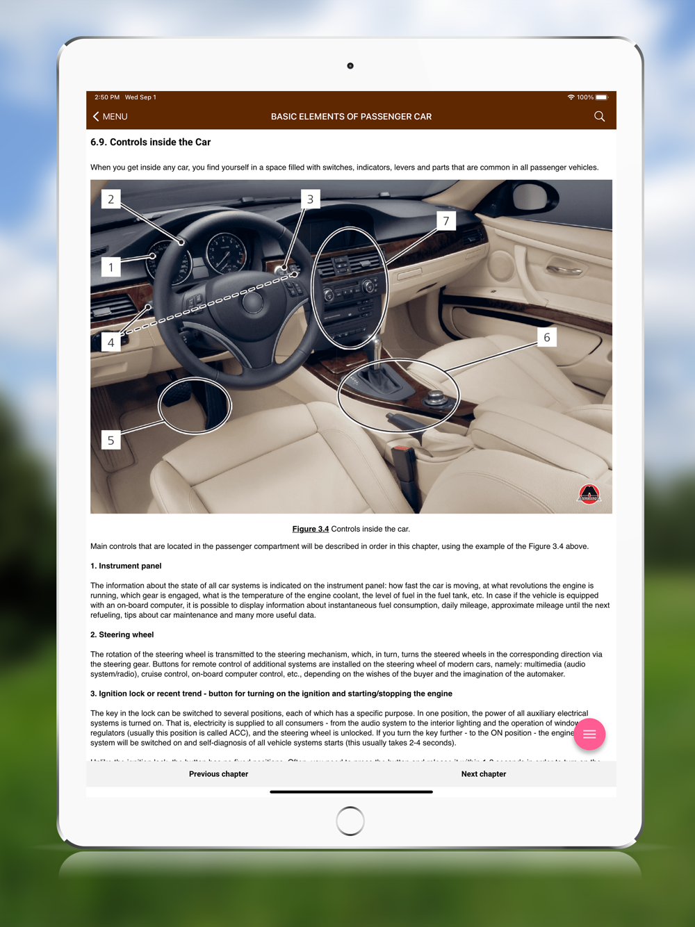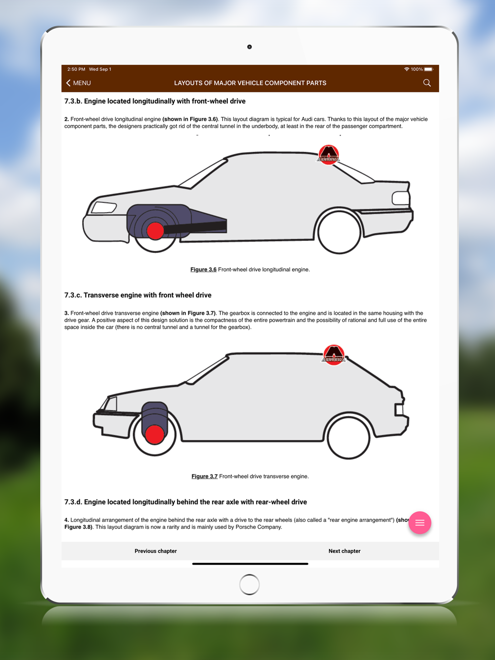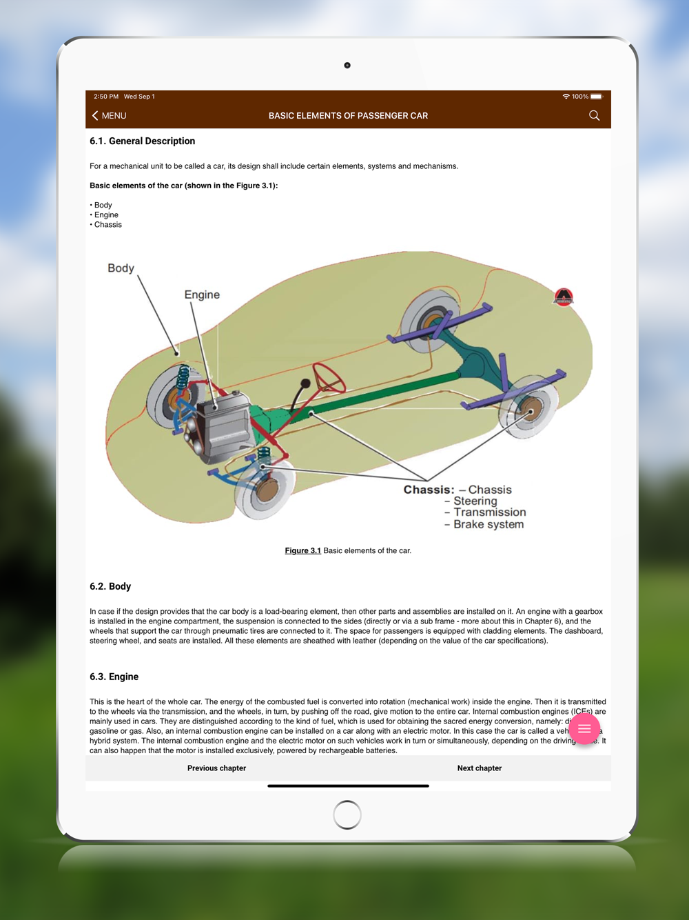 Getting started on this application, we set a goal to present a rather difficult theoretical course on the automobile engineering in the most accessible form. Basic knowledge of vehicles' structure will supply a novice driver with confidence in the fact that he will be able to control the situation of any breakdown, predict the amount of necessary work at the service station and just can competently exploit its vehicle.