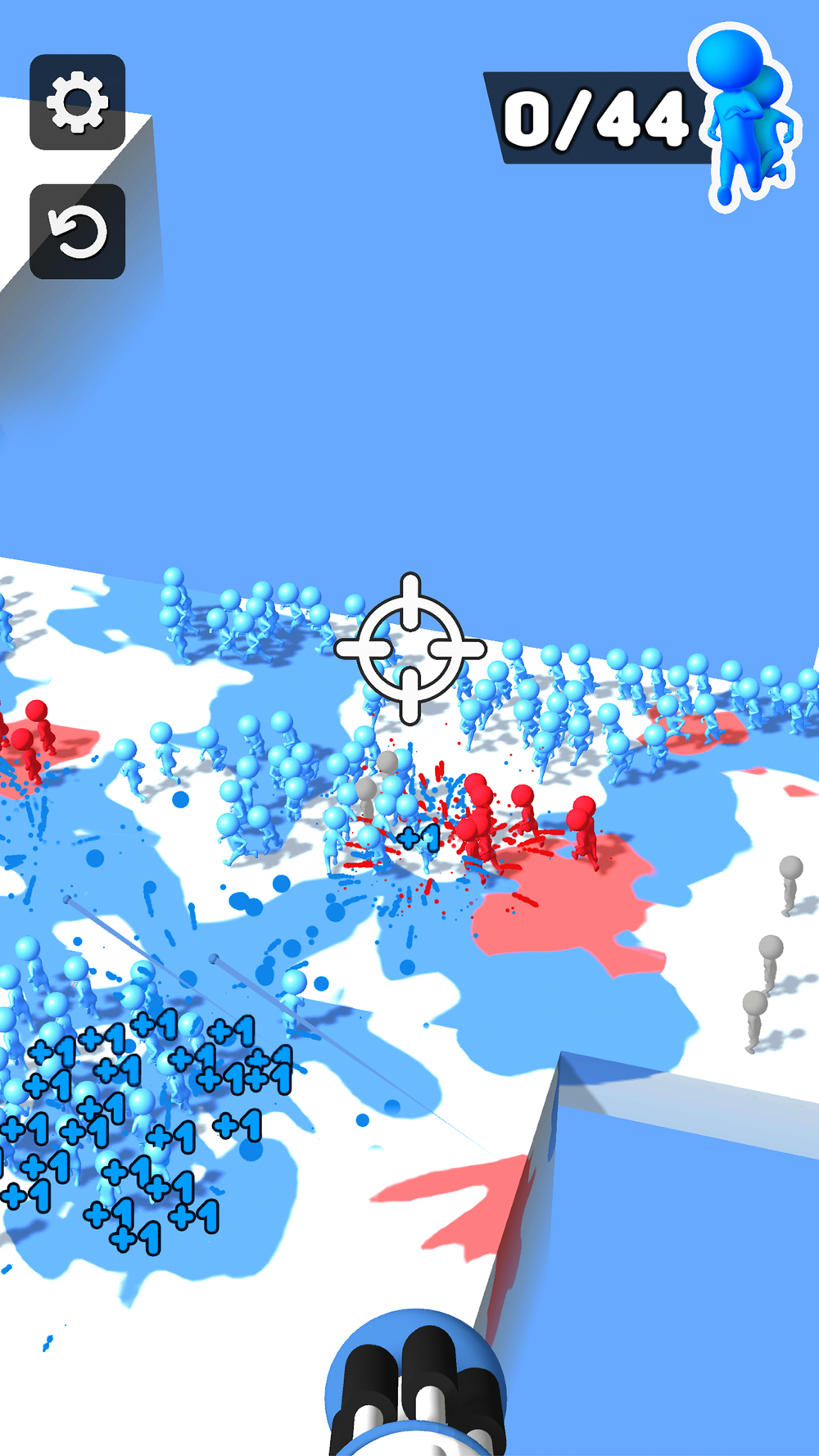The player's character flies the helicopter. At the bottom are the characters of allies and opponents. Allies attack opponents automatically. The player shoots paintballs. When the ball crashes into the ground, the nearest enemies become allies, and the ground gets painted.