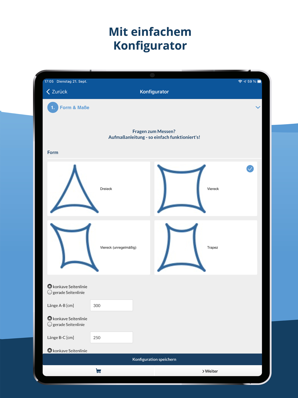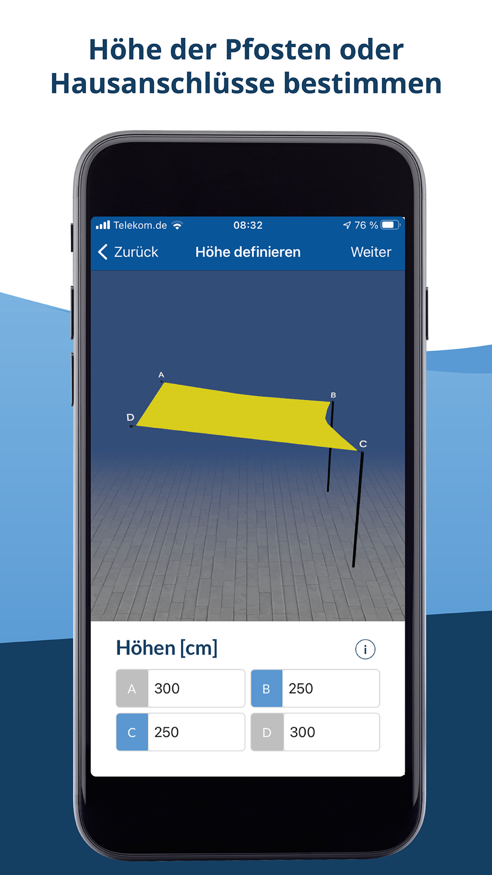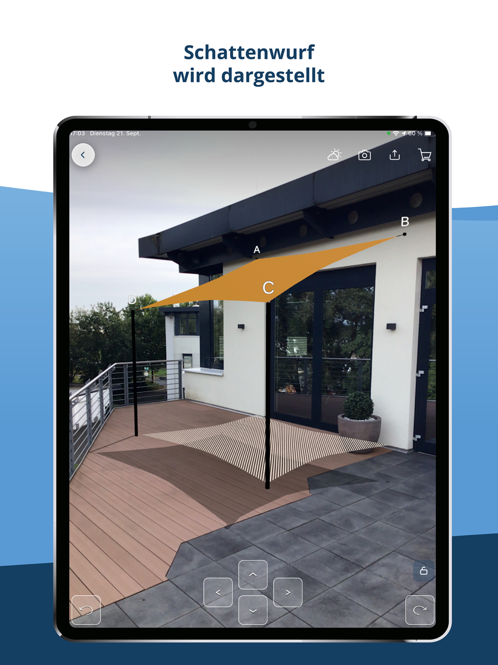 In der App – kompatibel sowohl für Smartphones als auch für Tablets - können Sie Ihr konfiguriertes Sonnensegel nach Belieben drehen und positionieren. Wenn Sie das Segel arretieren, können Sie Ihren Blickwinkel ändern. So können Sie Ihr neues Sonnensegel nicht nur von verschiedenen Perspektiven, sondern auch von nah und fern begutachten.