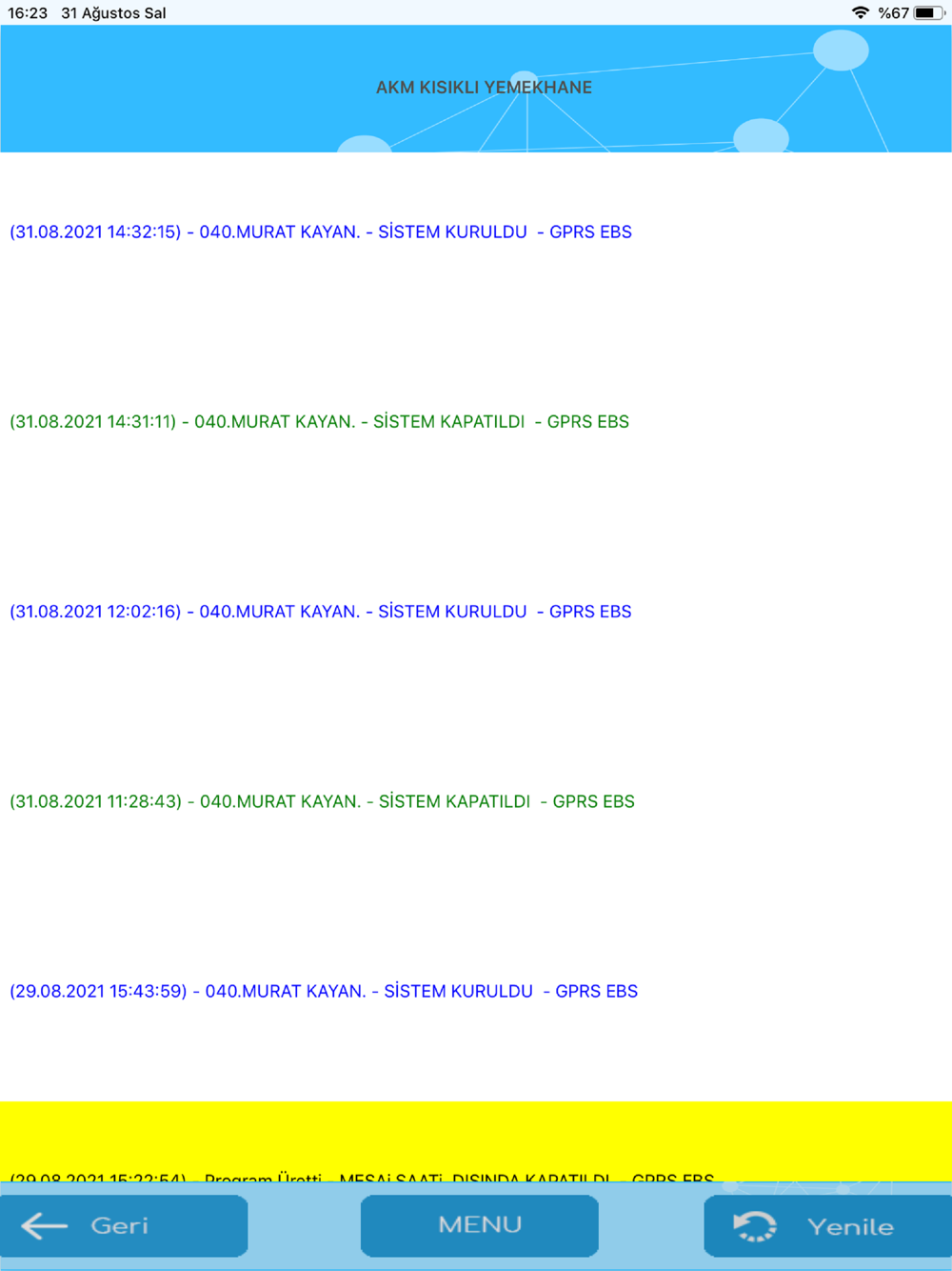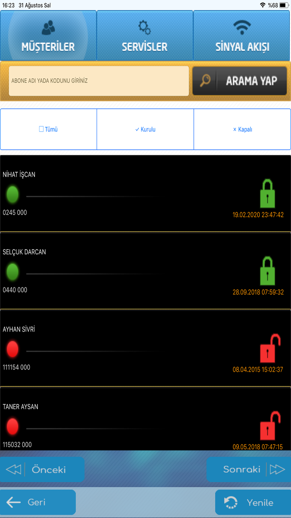 Aykan Güvenlik Müşterilerinin, Alarm panelleri üzerinden Alarm Merkezine gönderdikleri sinyalleri takip edecekleri uygulama. Bu uygulama ile alarm sisteminin kurulu olup olmadığını ve merkeze gönderilen son 30 sinyali görülebilir.