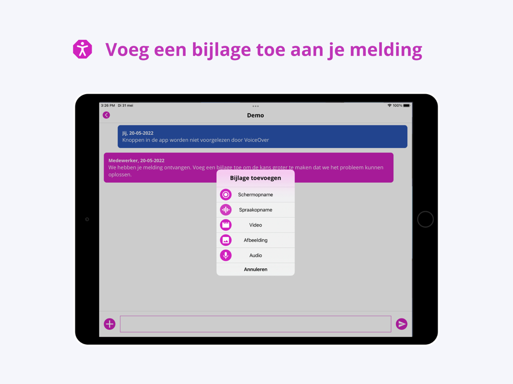 Na het maken van een melding kun je bijlagen toevoegen. Het liefst ontvangen we een schermopname, zodat we precies kunnen zien waar het fout gaat.