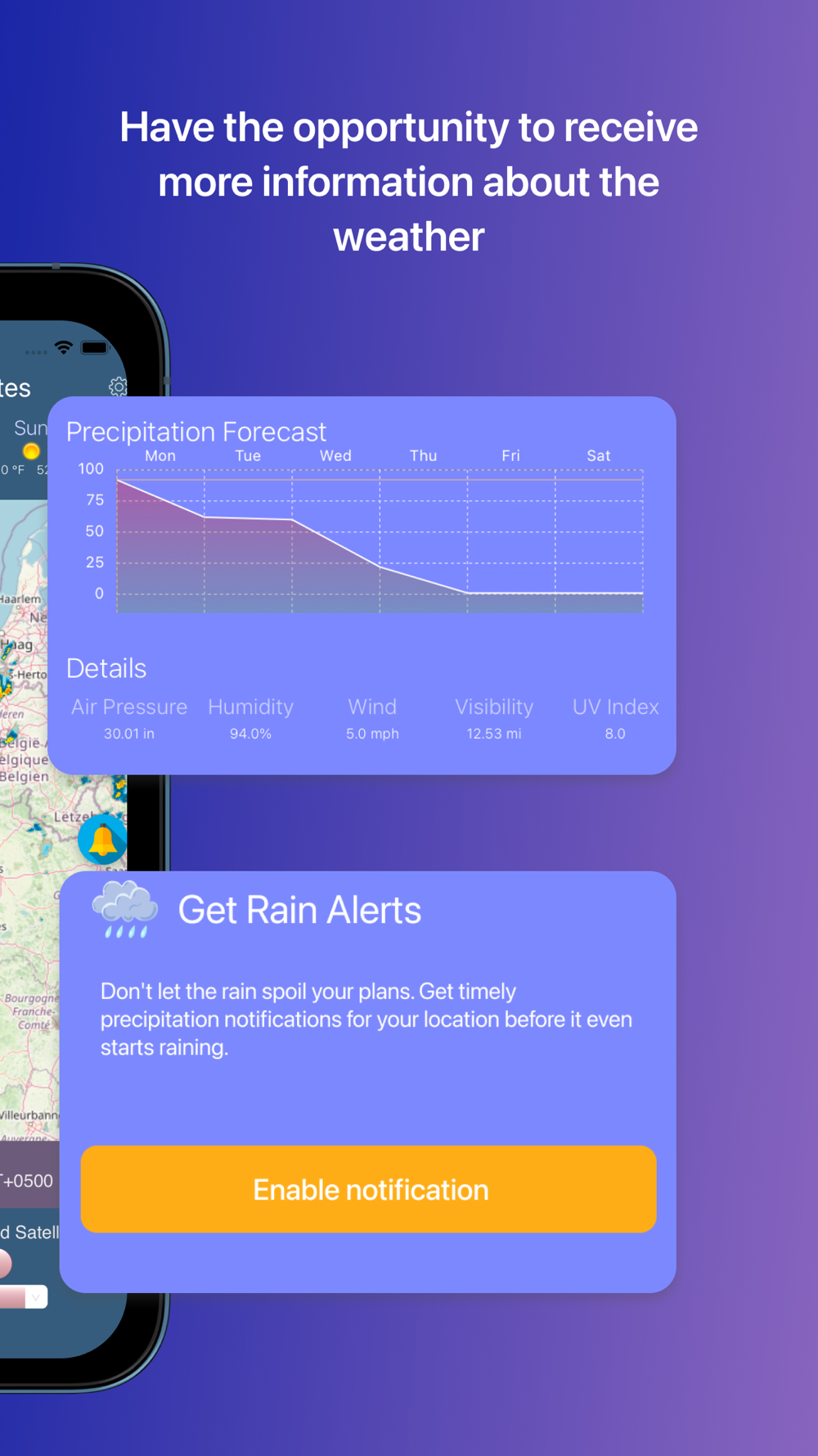 You will always be aware of impending precipitation with an interactive map and forecast for 7 days ahead.