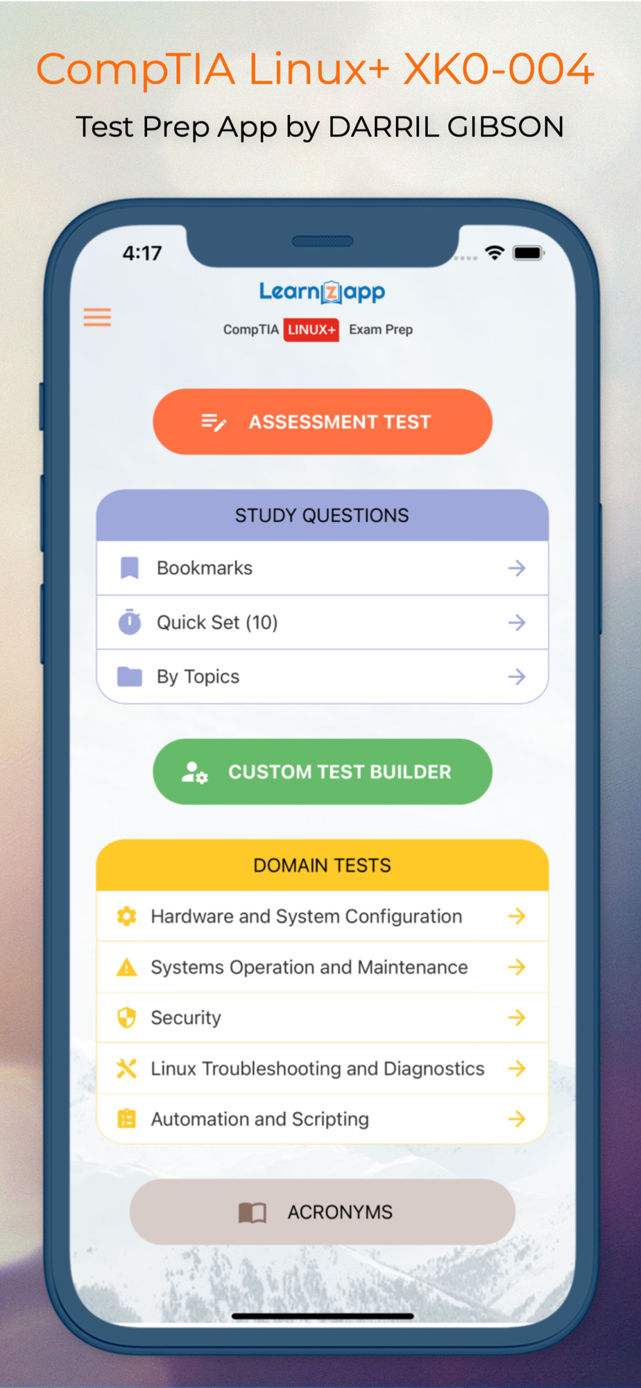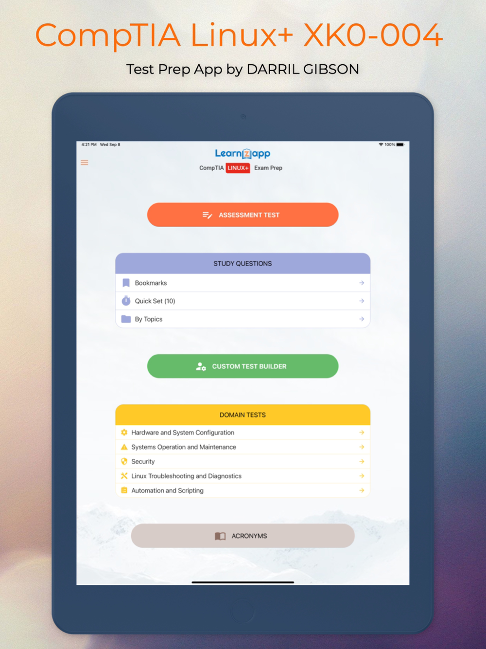 Score higher in CompTIA Linux+ XK0-004 certification exam, with this easy-to-use mobile app by Darril Gibson, author of top selling CompTIA certification prep books. It includes study questions, practice tests and Acronyms covering 100% of all exam objectives.
