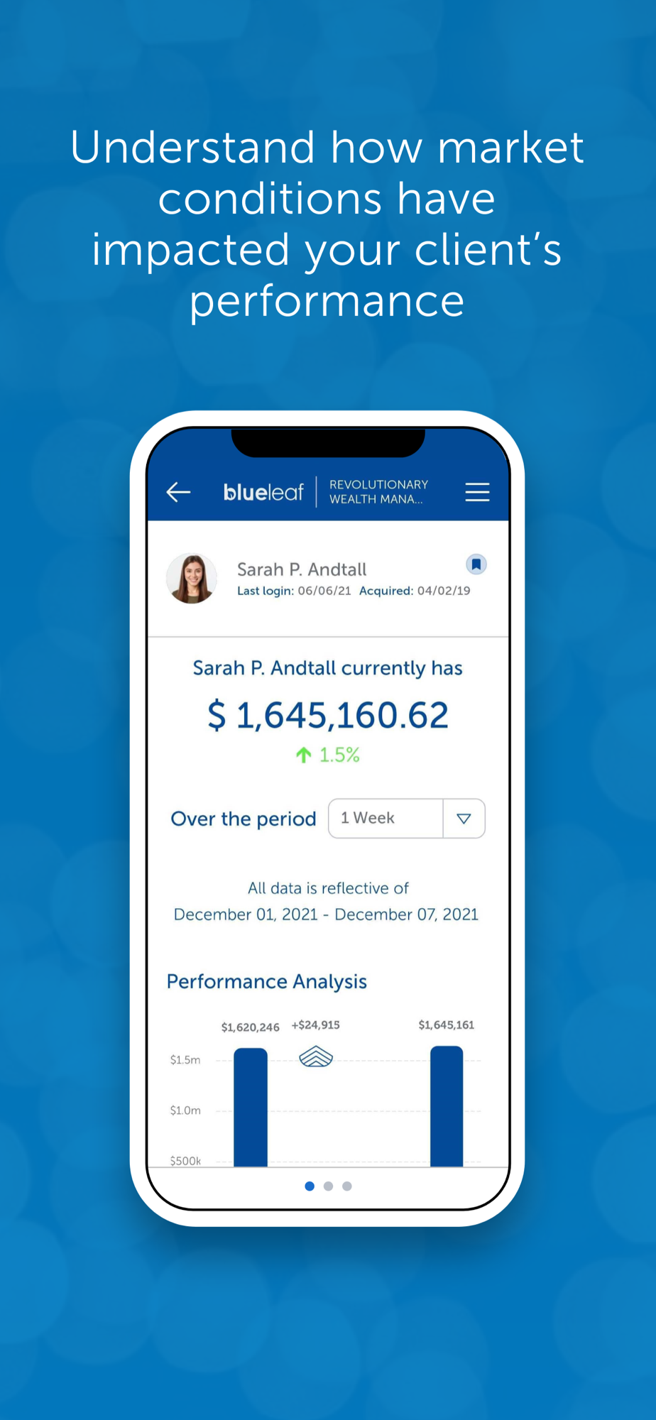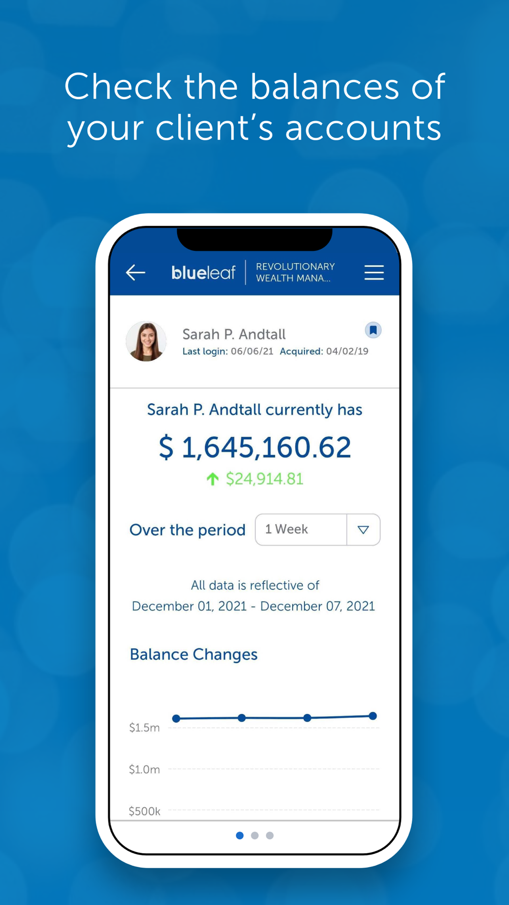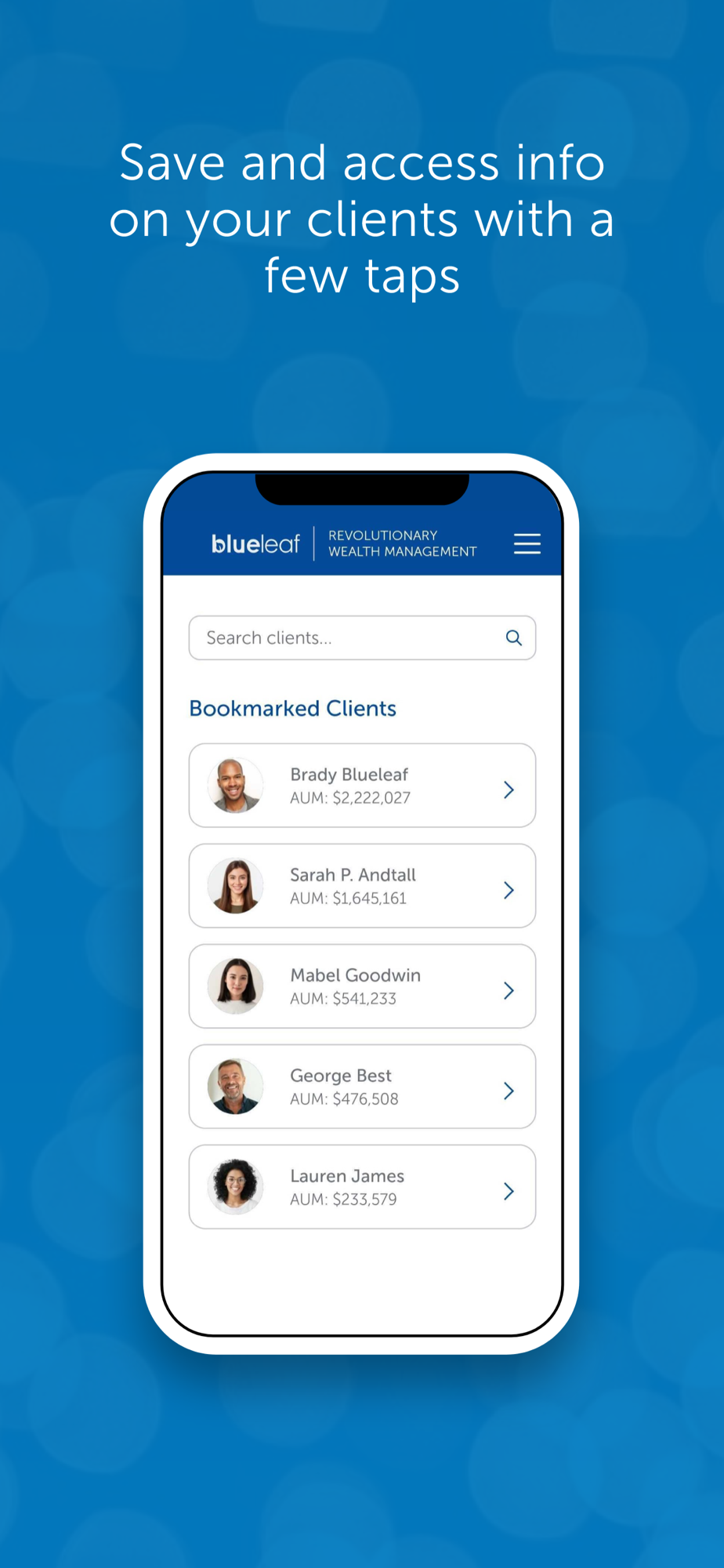 Sophisticated automation for wealth management firms, now available on your mobile phone. This app is for advisors subscribed to Blueleaf. Securely access client information on the go. Bookmark clients for quick access or search across your entire portfolio in seconds. Running your practice has never been so simple.