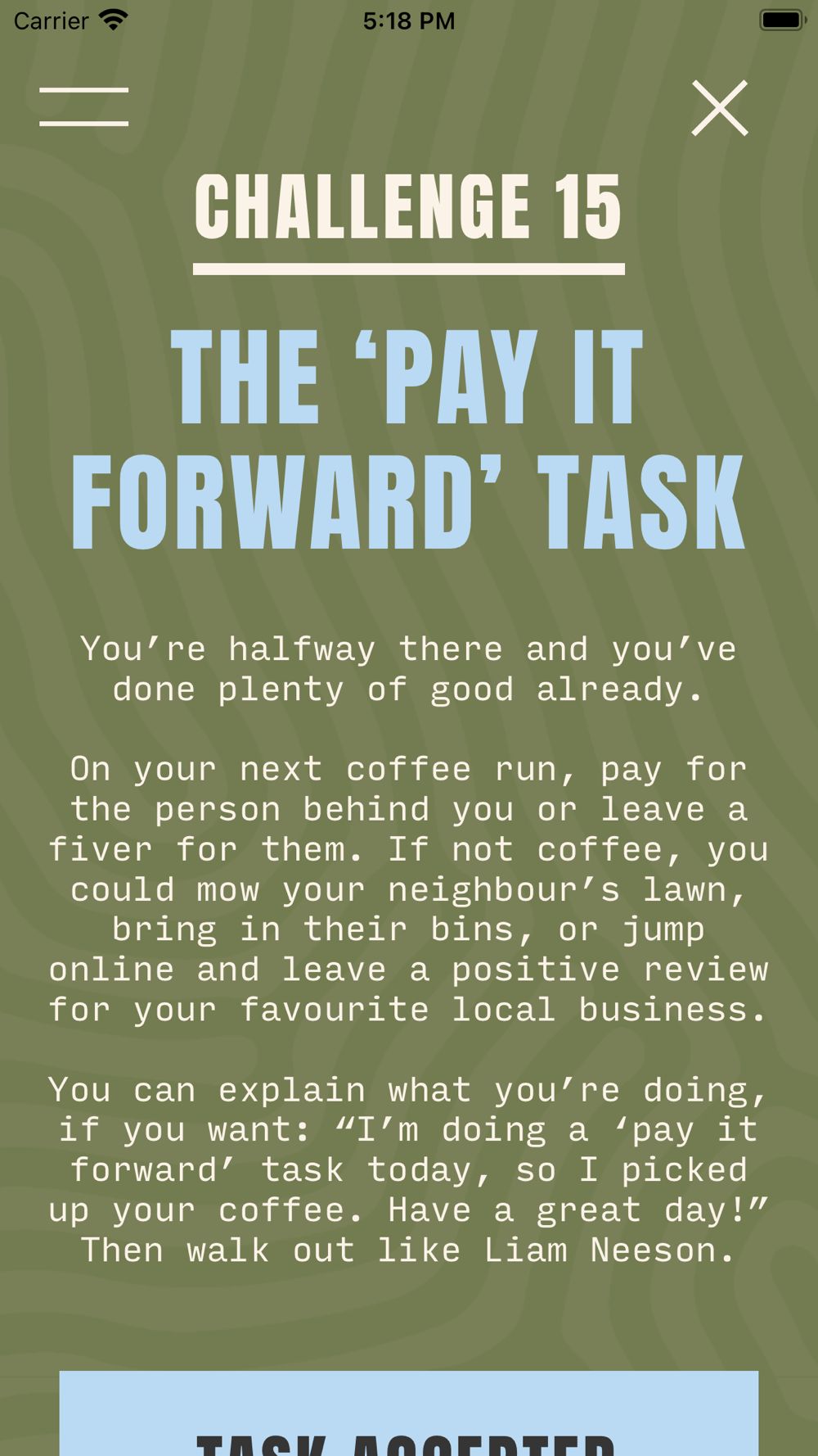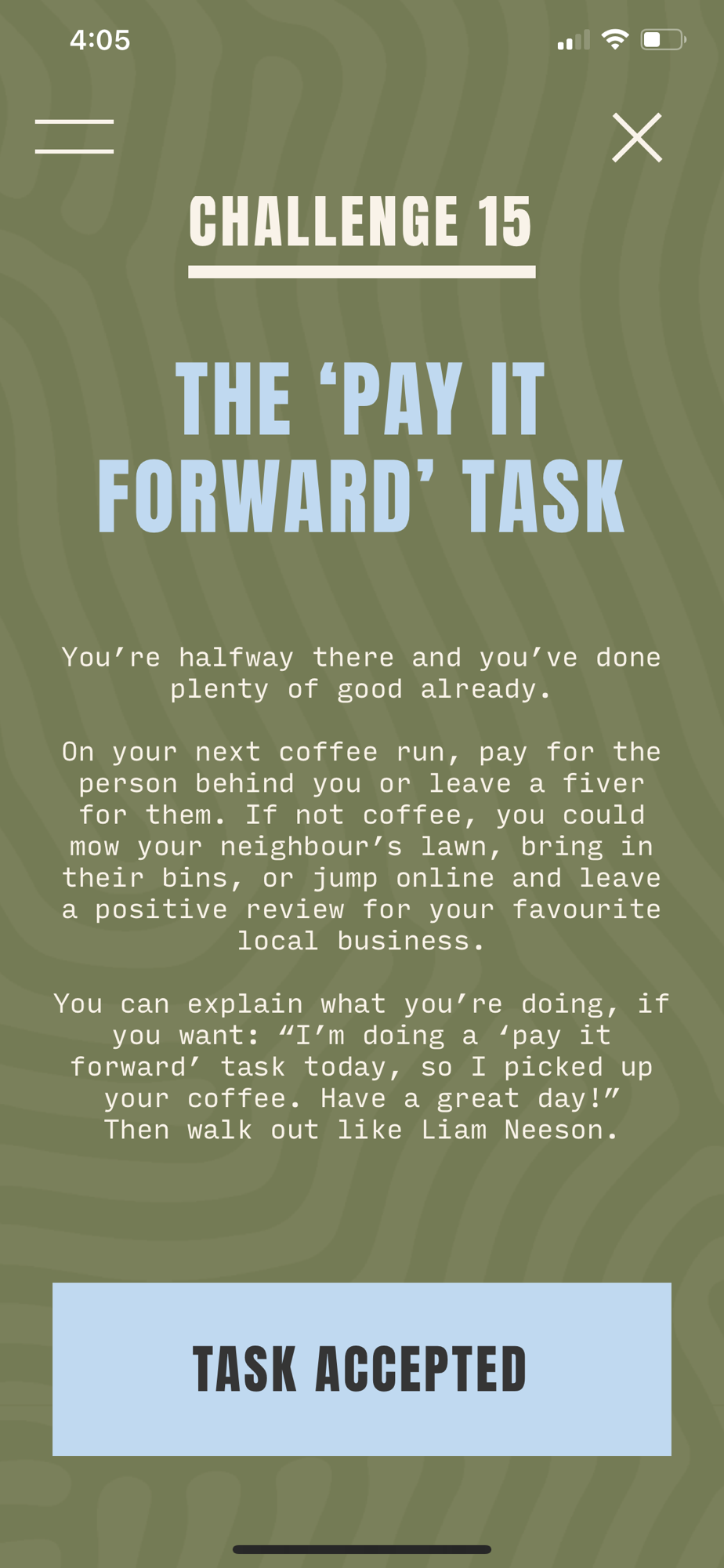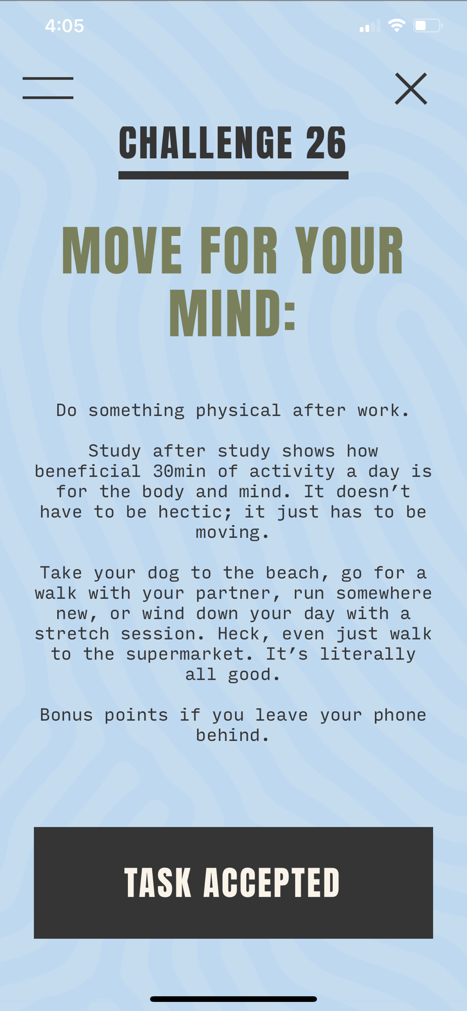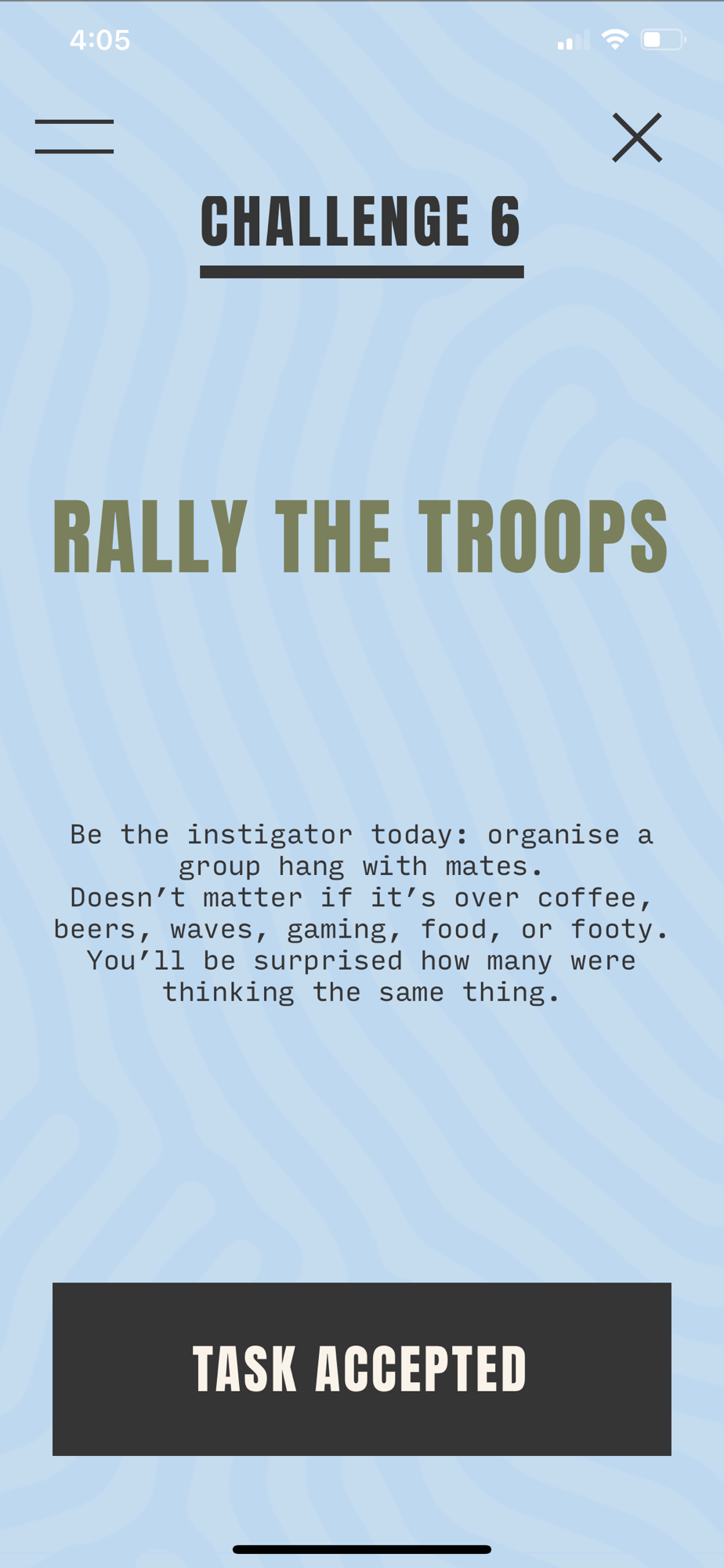 Our daily challenges encourage connection with mates, personal reflection and advocate self-care in your routine.