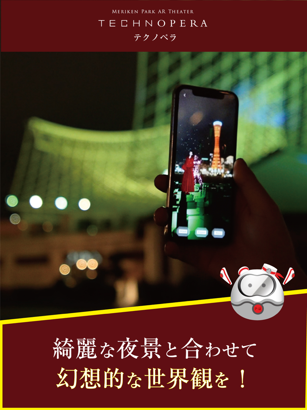 メリケンパーク内の9箇所のARポイントに専用アプリをダウンロード後にスマートフォンをかざすと、オリジナルキャラクター”奏 舞”(かなで まい)が登場し、デジタルオペラを鑑賞することができます。