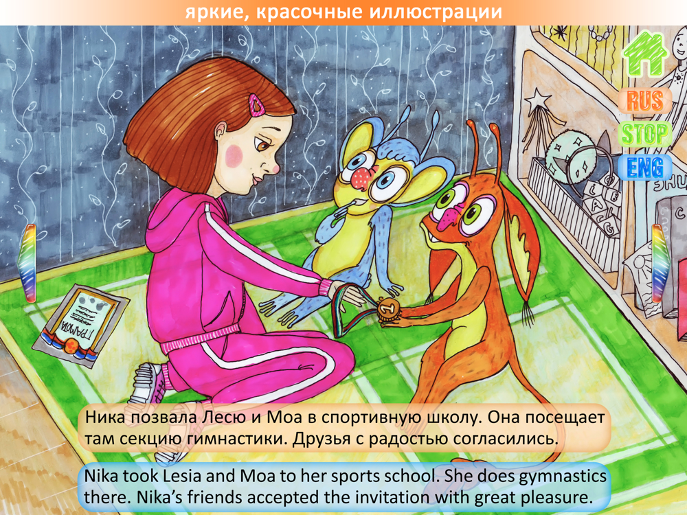 и понимания содержания на слух, яркие, красочные иллюстрации. Тексты озвучены детским голосом.