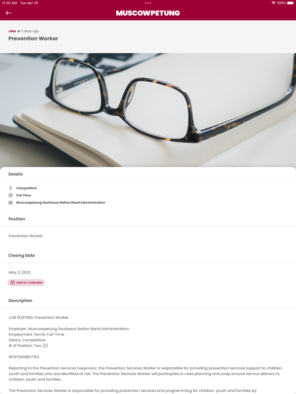 Welcome to the Official App of the Muscowpetung Saulteaux Nation! We have developed the Muscowpetung Saulteaux Nation app to be a communications platform for our community. Our app helps Muscowpetung Saulteaux Nation staff, community members, band members, and the general public to keep up with goings-on around the Nation.