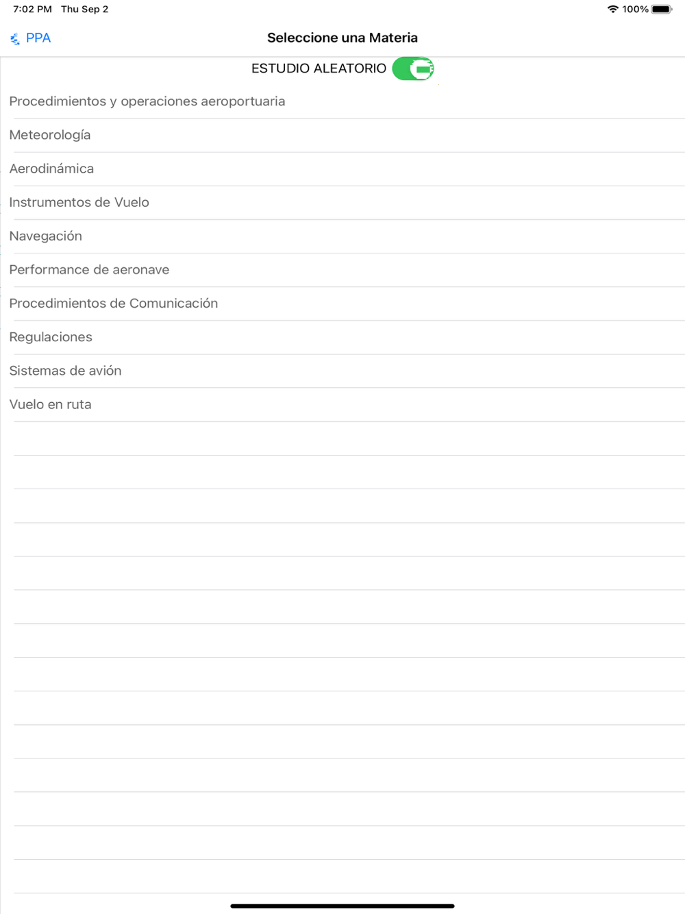 Una herramienta de preparación y estudio para el examen teórico para la obtención de la Licencia de Piloto Privado de Avión DGAC Perú. Mas de 457 preguntas y respuestas para tu estudio o practicas de Test. Esta app entrega una solución móvil para pilotos preparando su examen DGAC PPA escrito. Estudio por materia, practica exámenes y revisa tus resultados. Guarda tu estado para continuar estudiando mas tarde. Guarda las preguntas que respondiste erróneamente para estudiarlas mas tarde y optimizar tu tiempo.