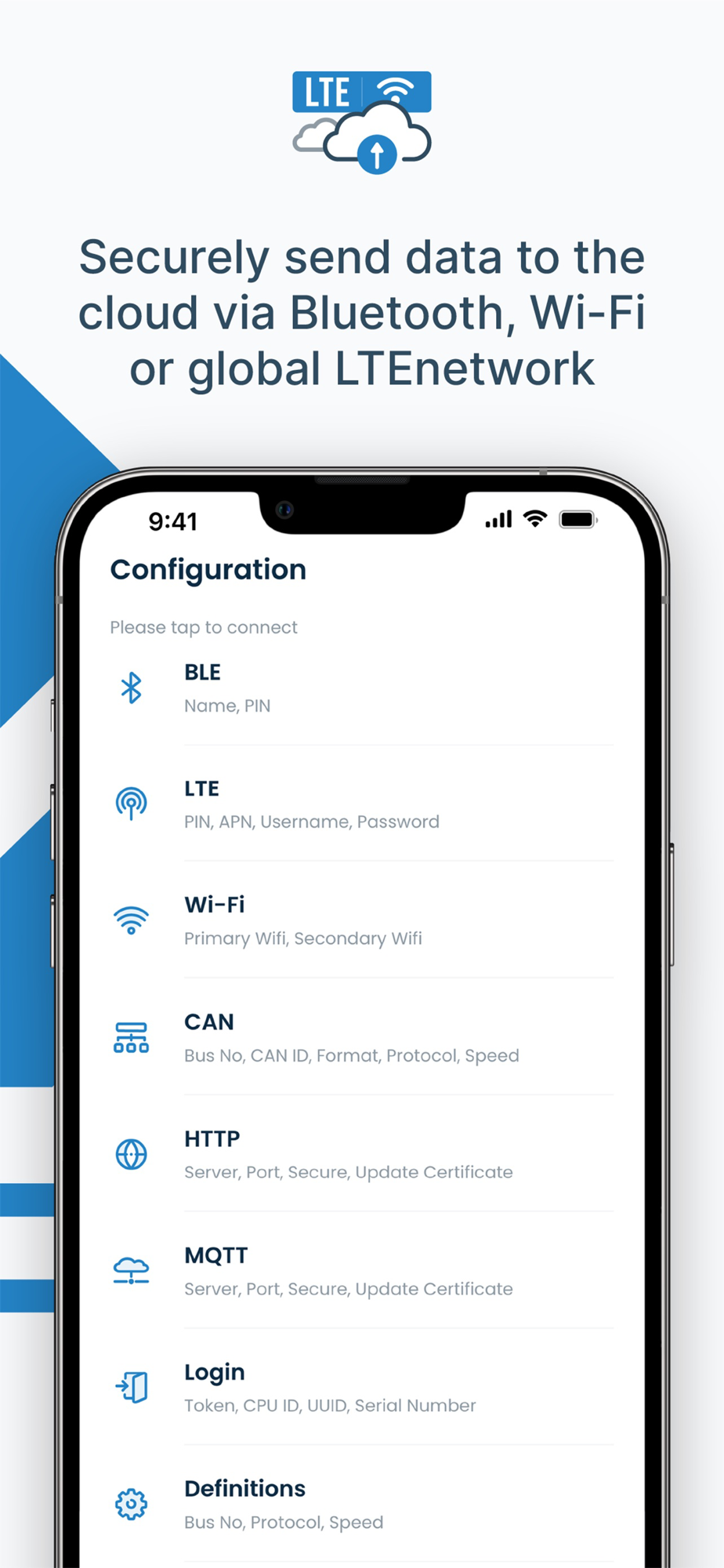 * Data transfer - BLE to transfer data from vehicles to the Conn.Logger application and LTE or Wi-Fi from application to the backend server.