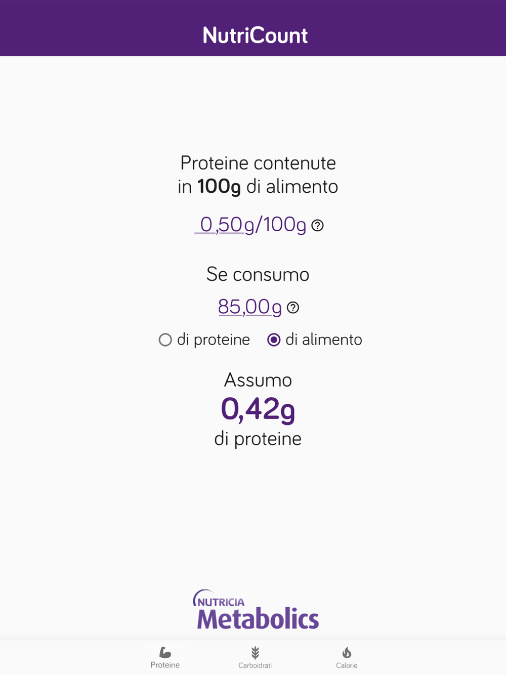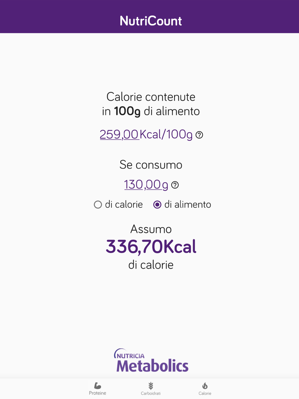 NutriCount è un App a supporto dei pazienti che permette di calcolare in maniera facile e veloce il quantitativo di proteine, carboidrati e calorie assunte o fornite da un alimento.