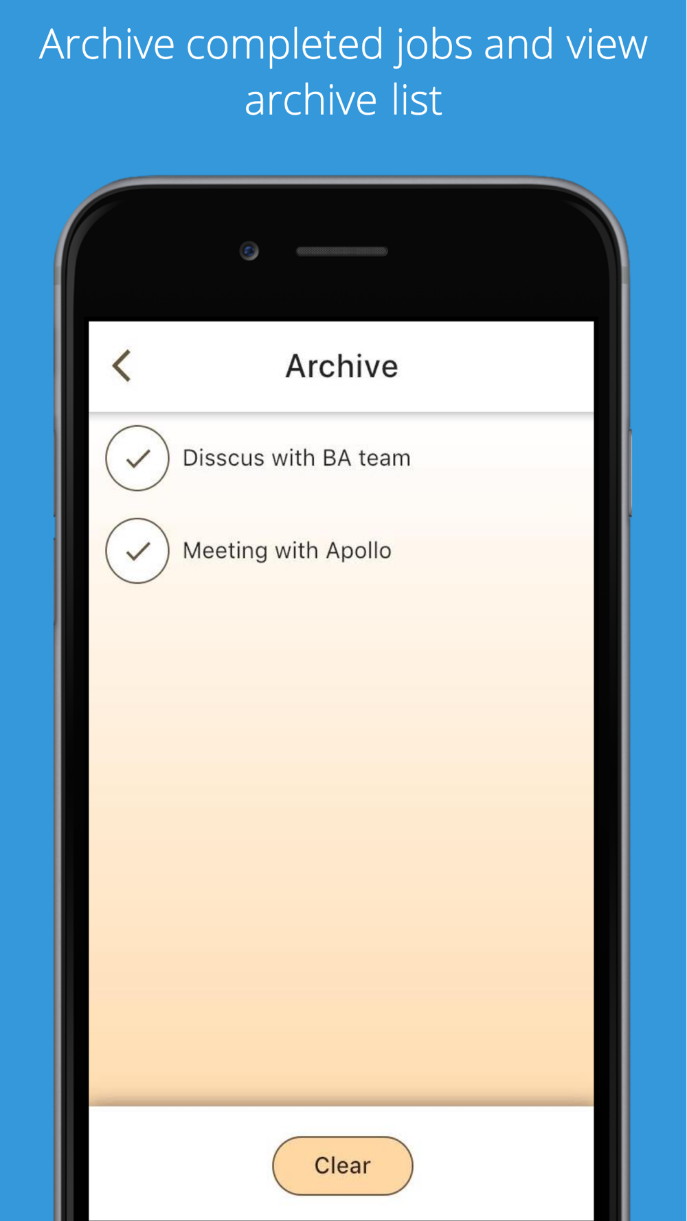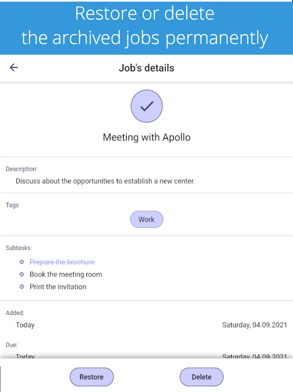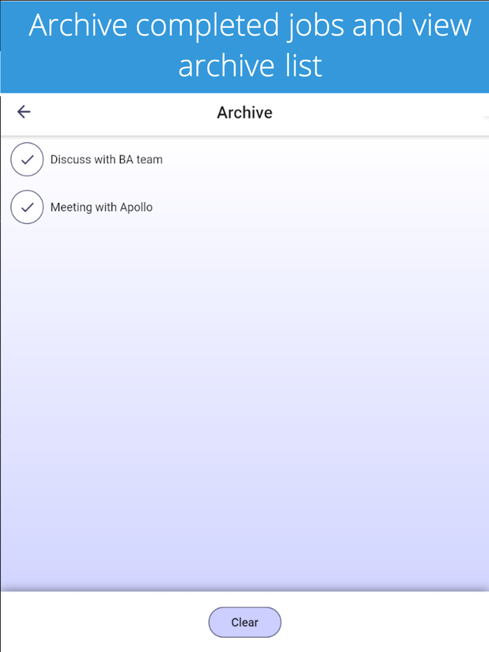 ARCHIVE THE COMPLETED JOBS: The jobs completed can be deleted/archived by swiping it to the left. You can see the archive list and clear or restore the archived jobs.