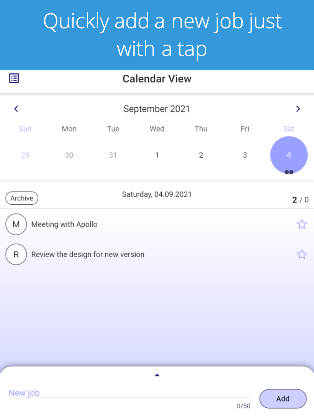 CREATE A NEW JOB WITH JUST ONE TAP: This allows you to create a job as fast as possible. Just enter the job name and tap the Add button. You can edit the job detail later if you want.