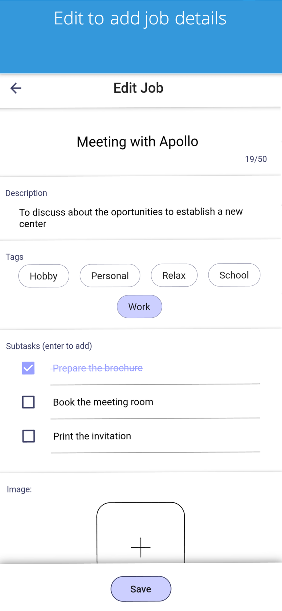 EDIT JOBS' DETAILS: You can tap on the job name the see the job details and tap the Edit button to add/edit the basic information such as job name, job description, image etc. Press on the image to view it in zooming style and swipe it to the right to return to the original view. Do a long press on it to delete the image.