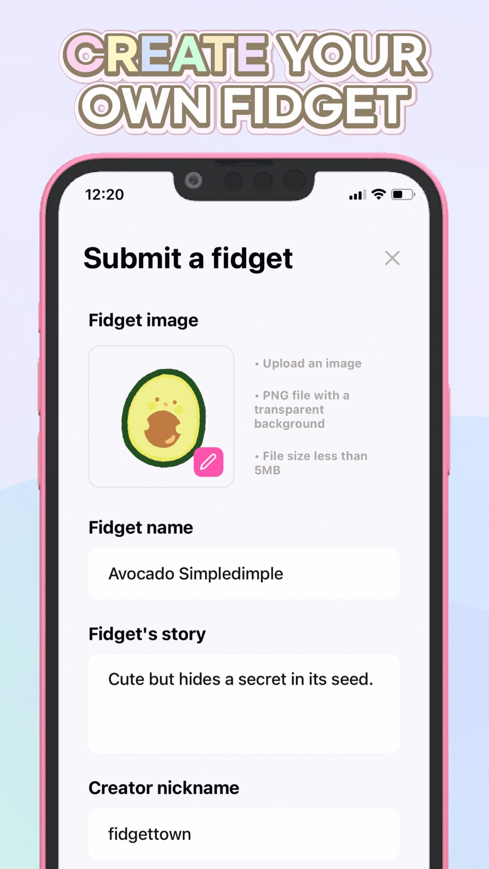 Fidget Town is a home for all kind of fidgets. Create your imaginary fidget and submit it! Selected fidgets will be later added after review. Your fidget can be a rare fidget that everyone wants to own!
