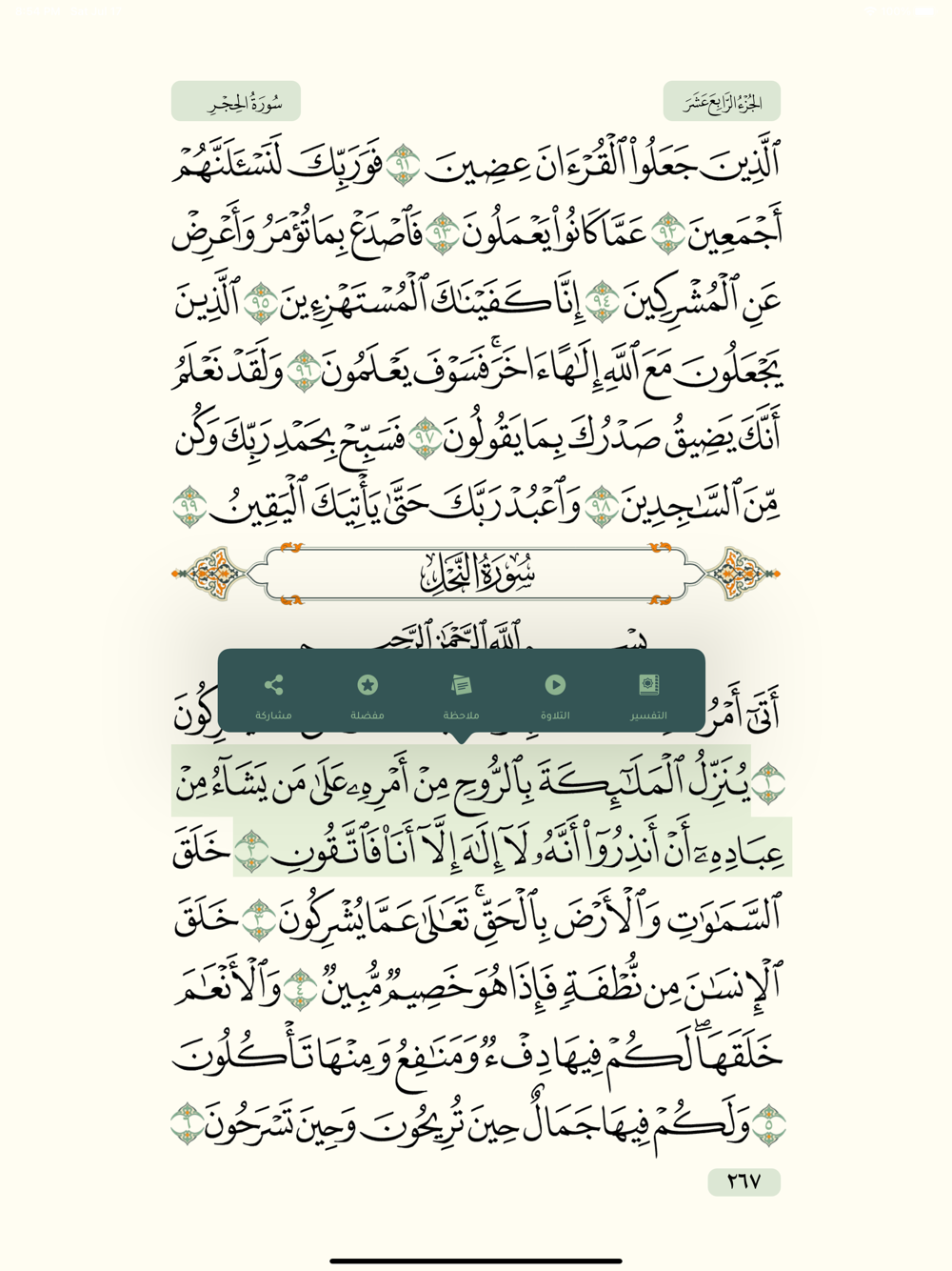 The App provides a user-friendly experience, as well as a comfortable and interactive recitation of the Uthmani text of the Mus-haf. It enables the user to reach the Juz’, Surah, or Verse very easily.