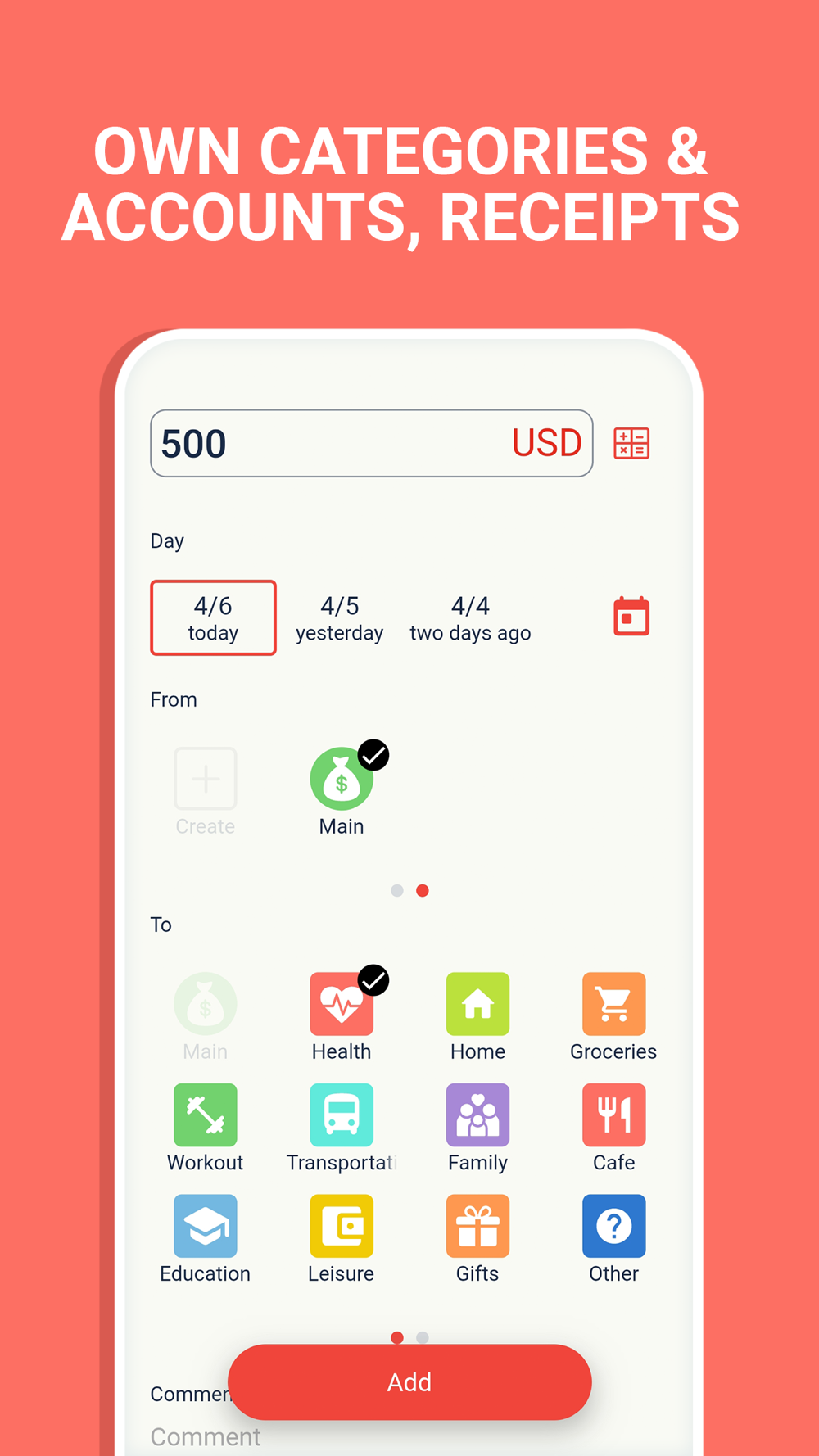 With an intuitive interface the process of adding expenses and revenue will be fast: fill in only key information with just a couple of taps, or add such further details as comments or photos of the receipt to the transaction.