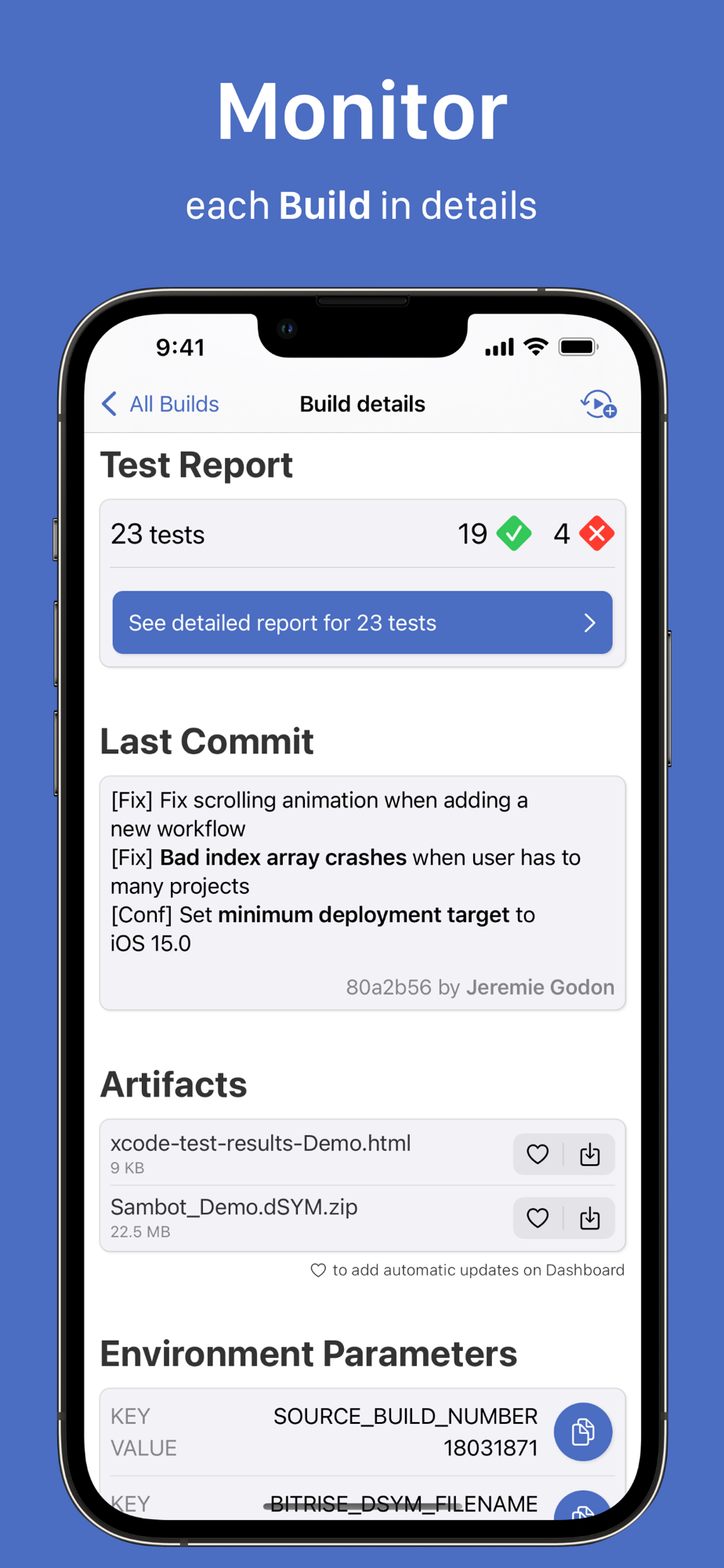 • Follow builds Steps (live or afterward) parsed from Bitrise log to instantly identify what's happening