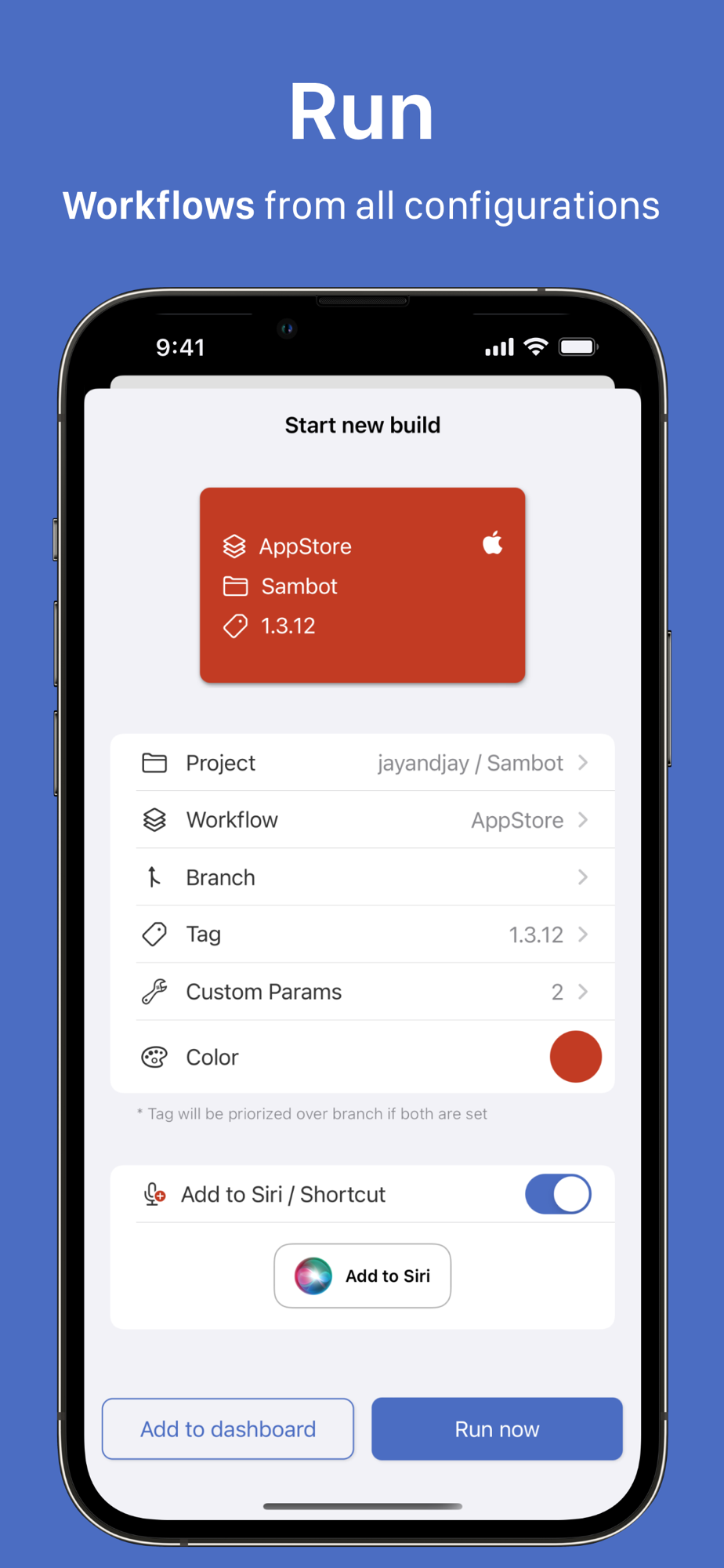 • Launch your favorites Workflows / Builds with Shortcut & Siri