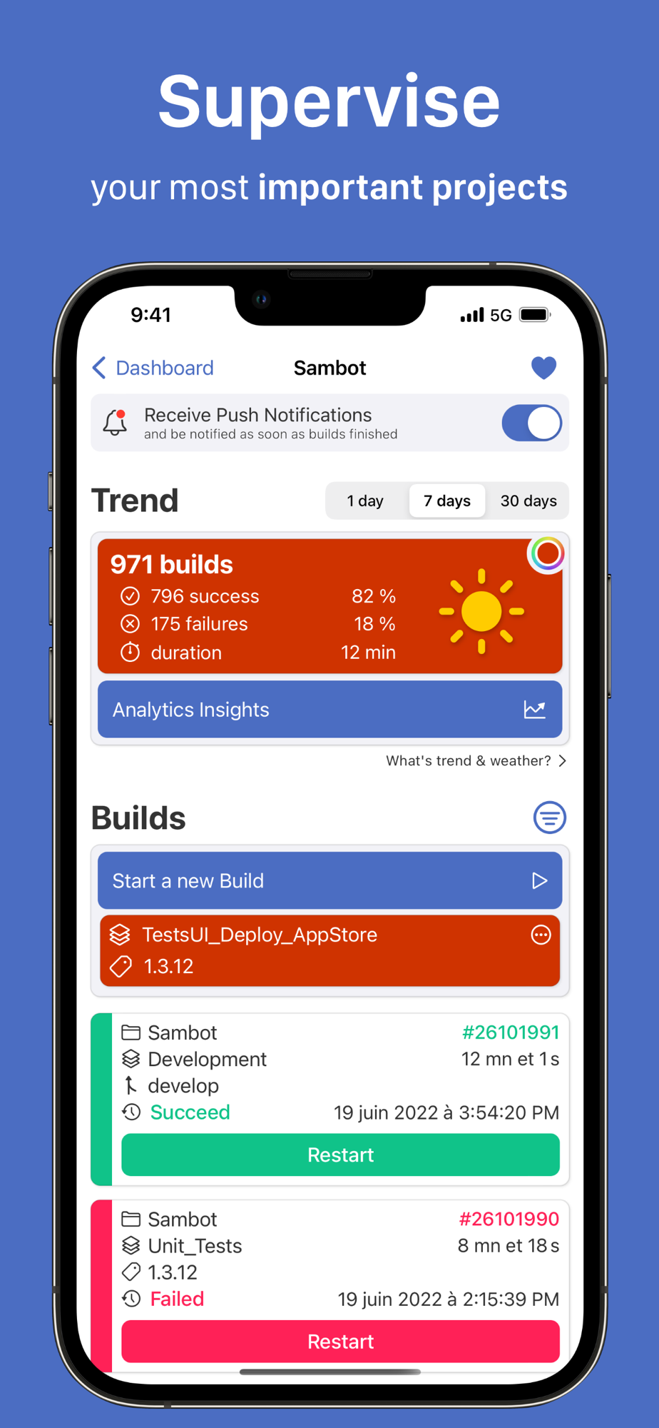 • See projects Statistics (success, failure & average duration) and projects Trends through a nice weather forecast representation