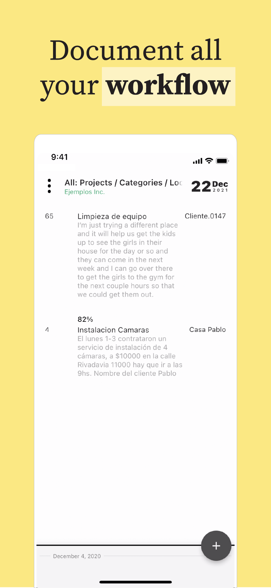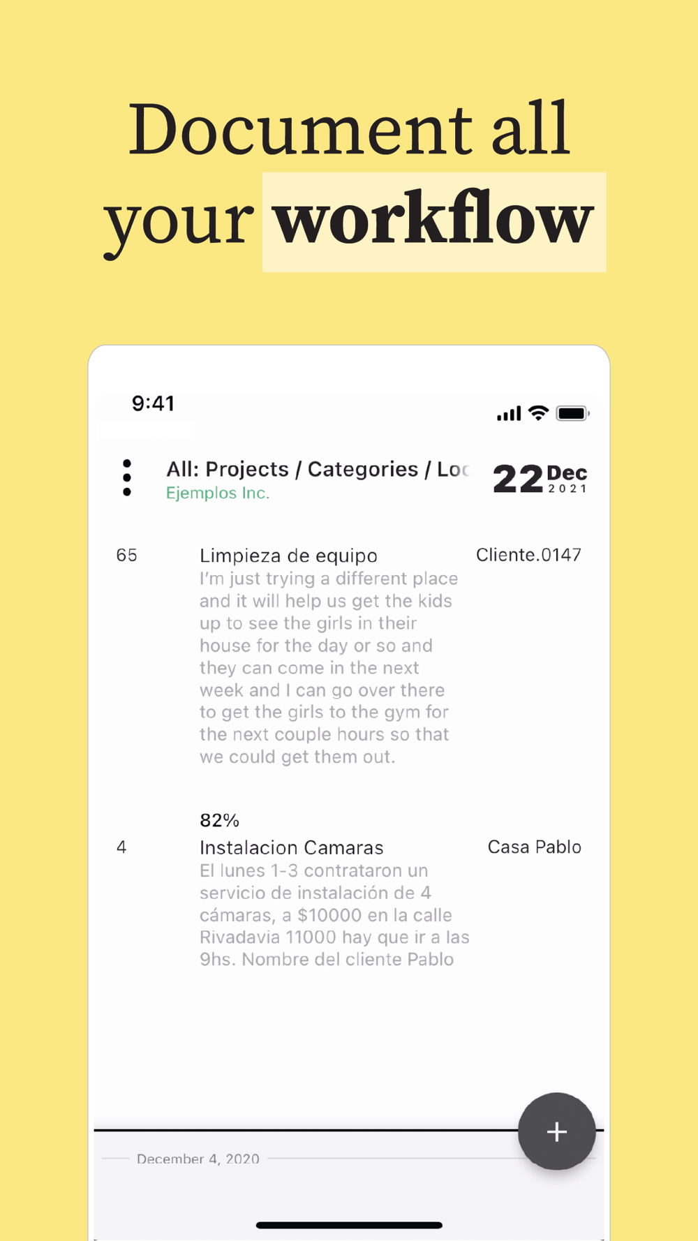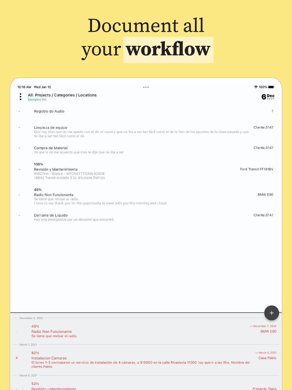 Add photos, comments, location and details so it is all neatly organized and accesible by searching through dates and project names.