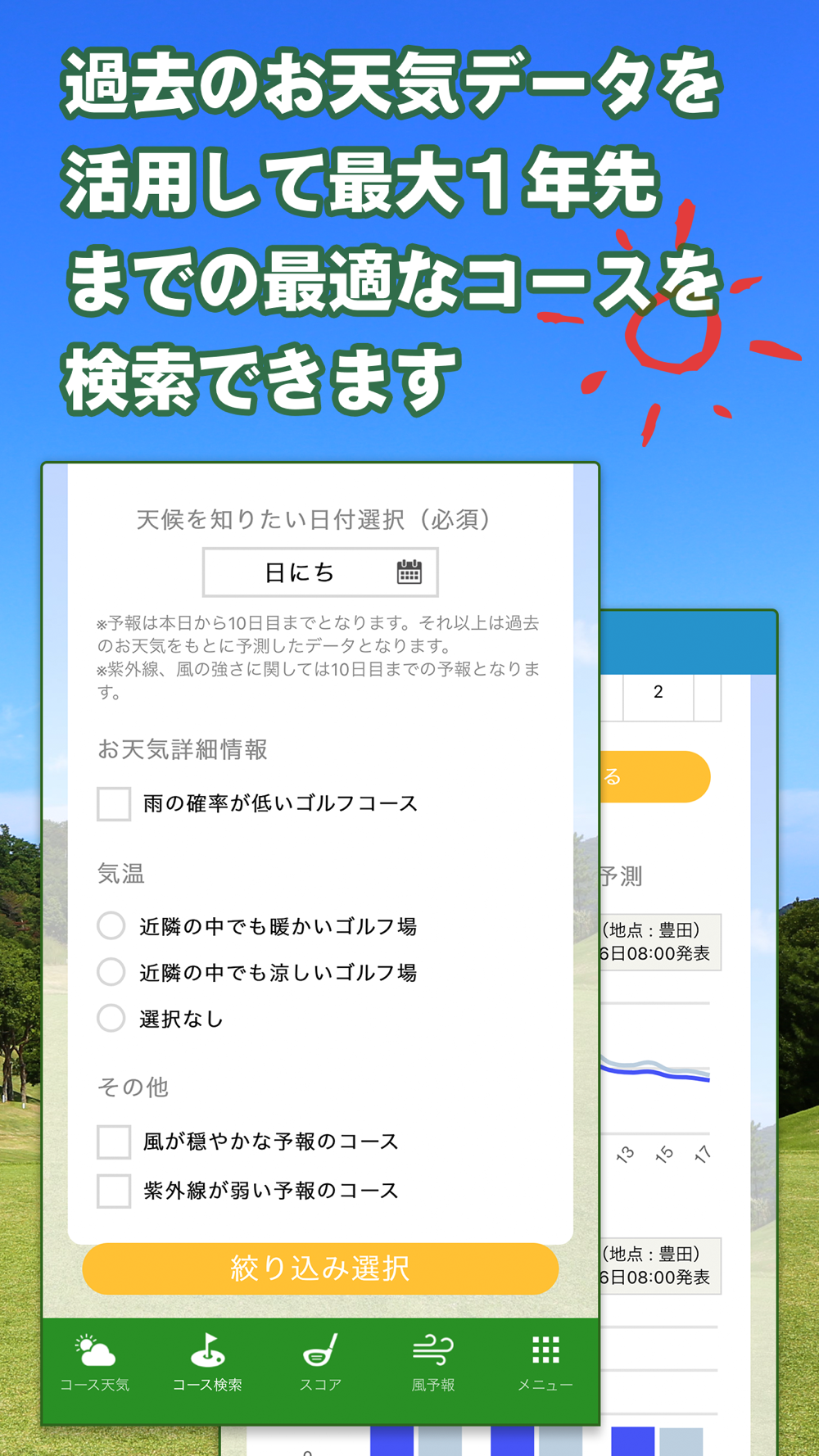 ・さらに、天気予報専門メディアtenki.jpならではの「気象条件」から最適なゴルフコースを検索頂けます。