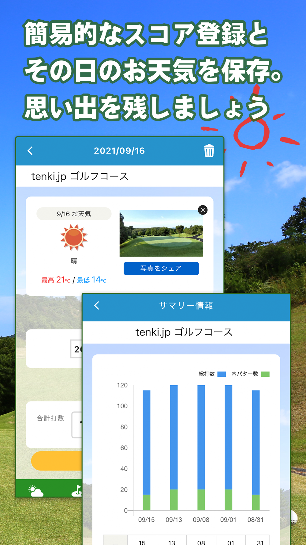 ・簡易的なスコア登録と、プレイをした日の天気や気温、写真も保存できるので、季節や天気を軸として、ご自身のスコア傾向を把握することができます。