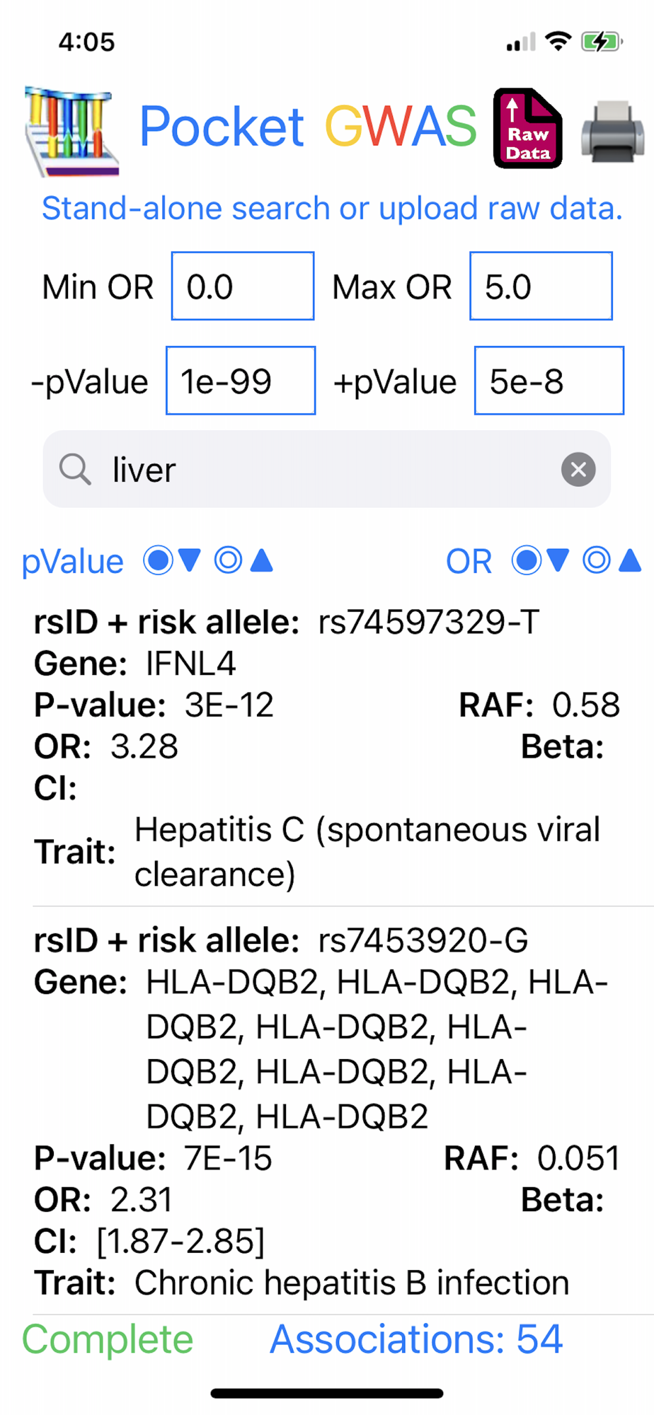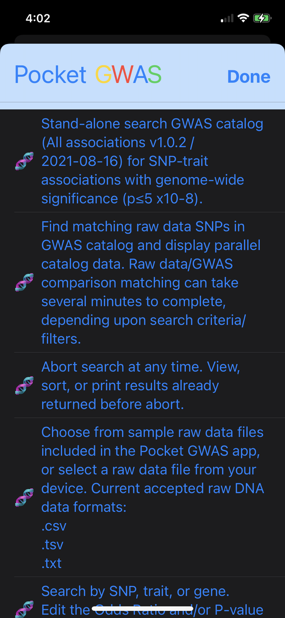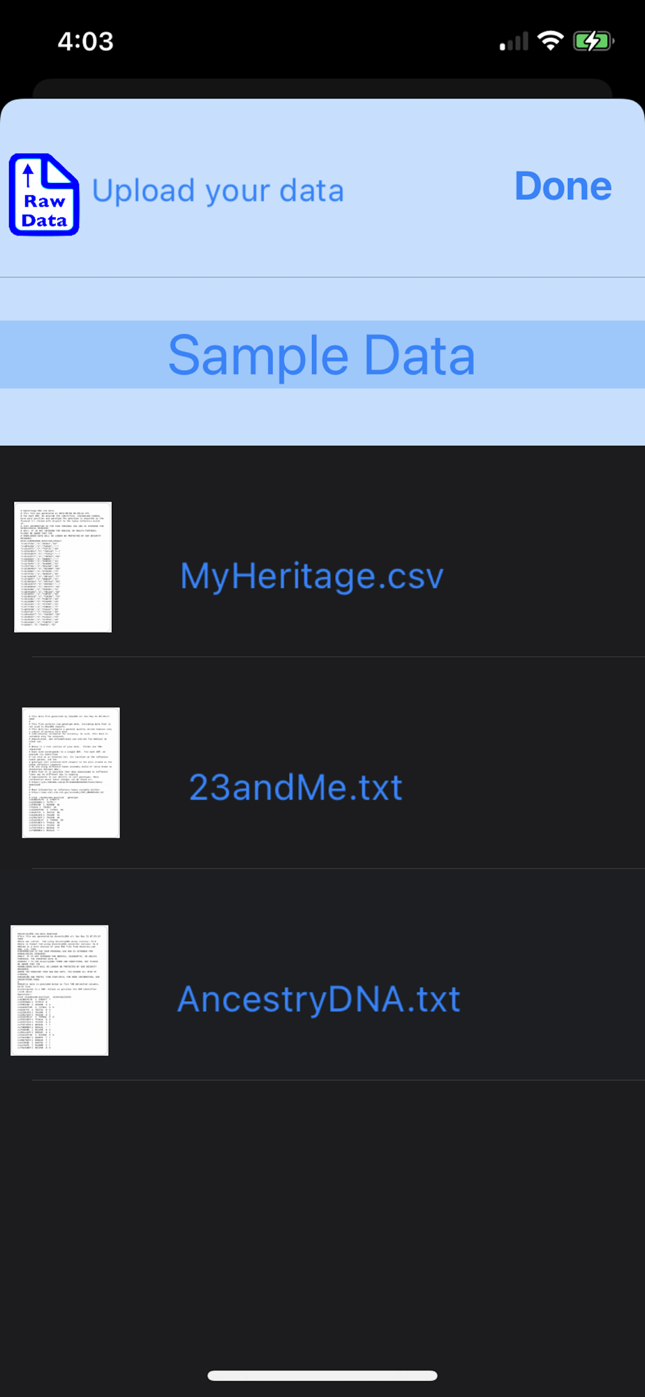 Choose from sample raw data files included in the Pocket GWAS app, or select a raw data file from your device. Current accepted raw DNA data formats: csv, .tsv, .txt