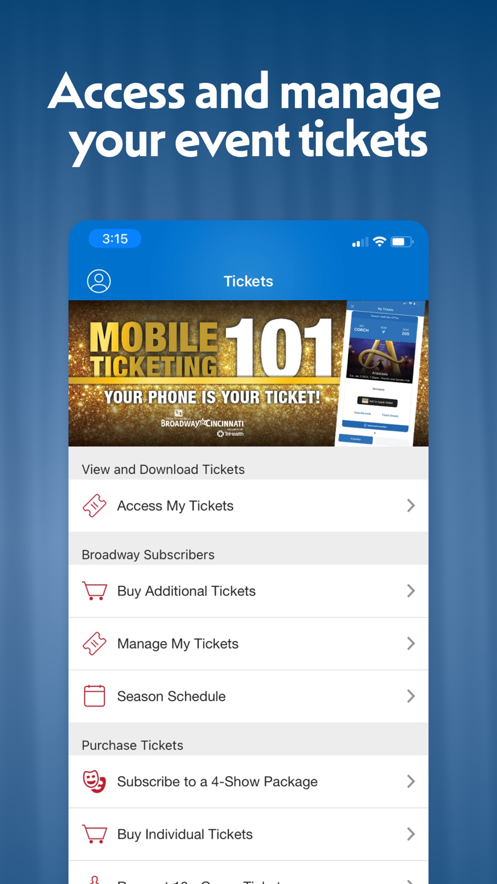 Broadway in Cinncinnati is pleased to introduce a new app just for Season Subscribers and eCLUB members. Your phone is now your ticket to enter the Aronoff Center for the best of Broadway. Season Subscribers and eCLUB members can easily access all of their Broadway tickets from the app, buy tickets for upcoming shows, and even transfer tickets to others attending the show with them. Plus, season subscribers can access their invoice at renewal time and exchange tickets if a conflict comes up.