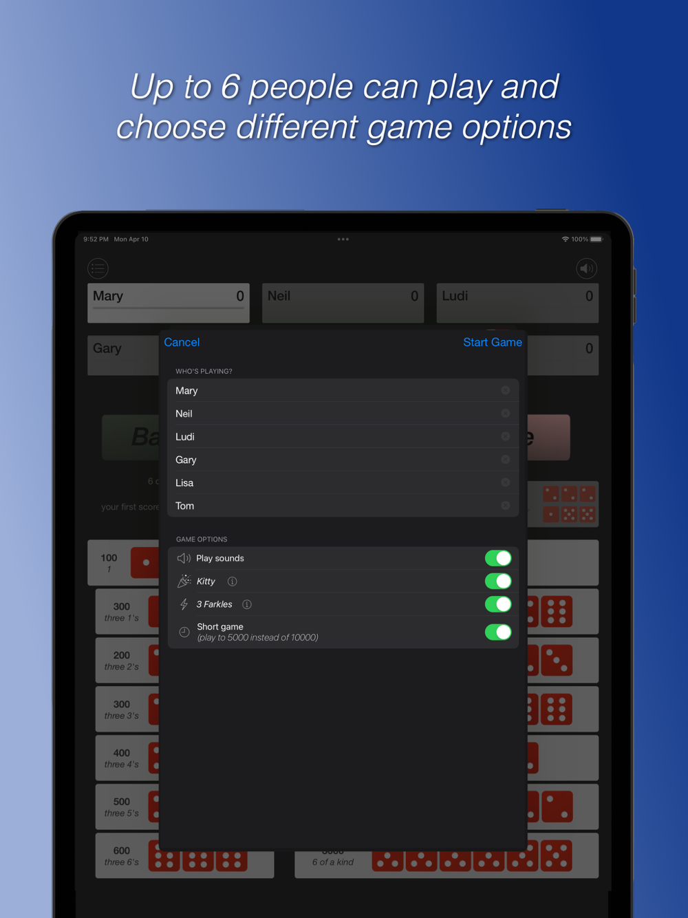 Farkle is a family-friendly game. It can teach lessons in probability and risk-and-reward. Instructions for playing Farkle are included in the app. It is a little tricky to keep score in Farkle - but this app makes it easy. This app is a Farkle scorer - you NEED 6 REAL DICE to play with this app.