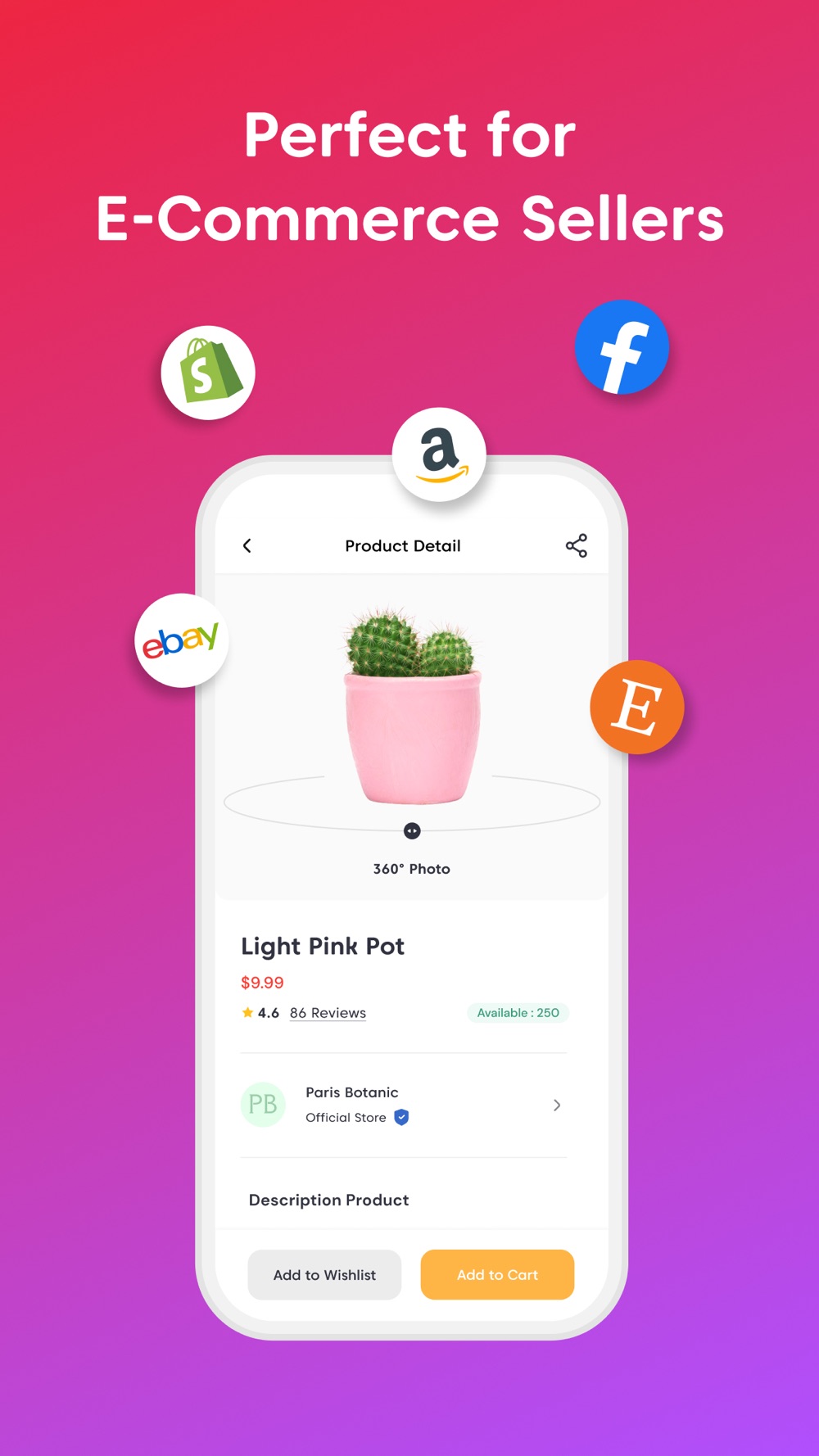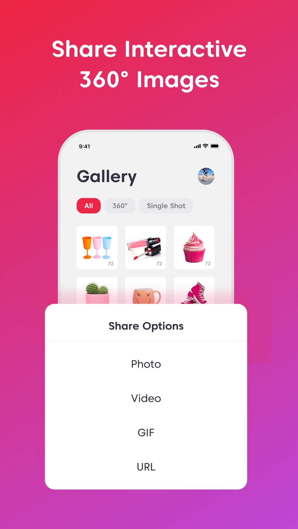 Create 360° photos of your products like a pro. With a tap of your finger, Studio will create 360° images of your products.