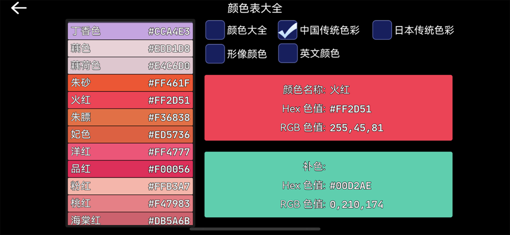 颜色大全是一款关于配色的小工具。包含了按色相配色方案,按印象配色方案。包含了用主题与关键字查询的工具,可查找建议的配色。内置颜色表大全,提供了中国传统色彩表,日本传统色彩表,中文名颜色表,英文名颜色表,颜色大全表等,可快速找到想要的颜色。颜色设计模块,是根据配色理论复刻出来的,可轻松进行颜色搭配与设计。