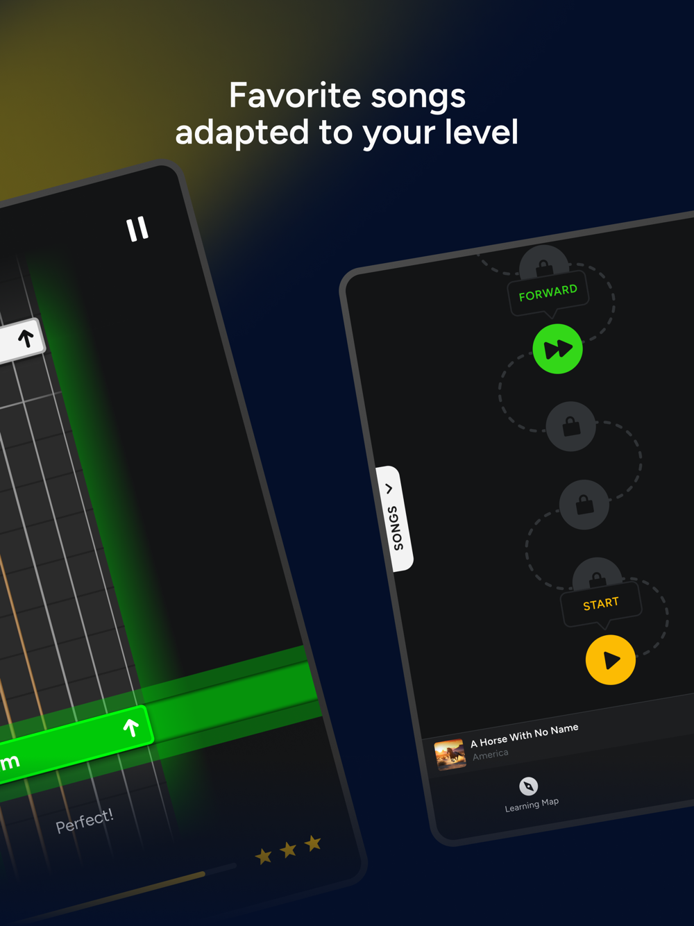The app focuses on your wants and needs instead of a standard guitar learning curriculum. You will learn through your own personalized learning path and the app will adapt to you.