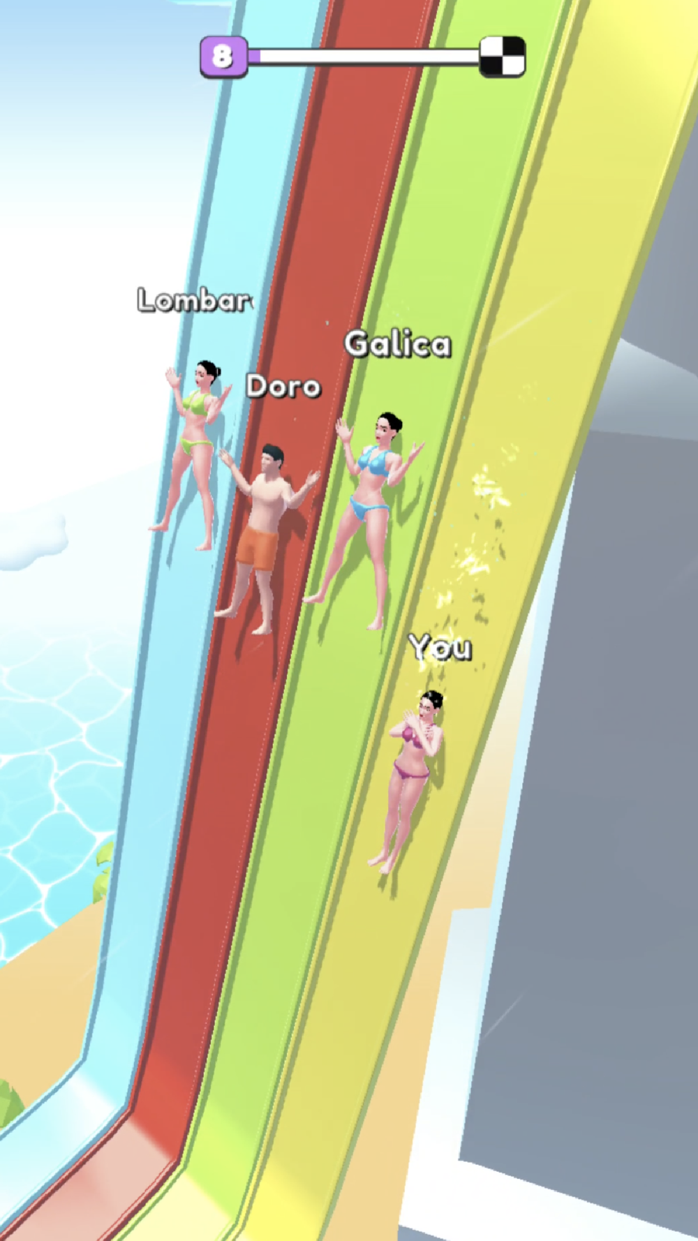 Hold down to be more aerodynamic and increase your sliding speed, release your finger to increase the friction and reduce your speed down the slide. Race other opponents challenging you in the waterpark.