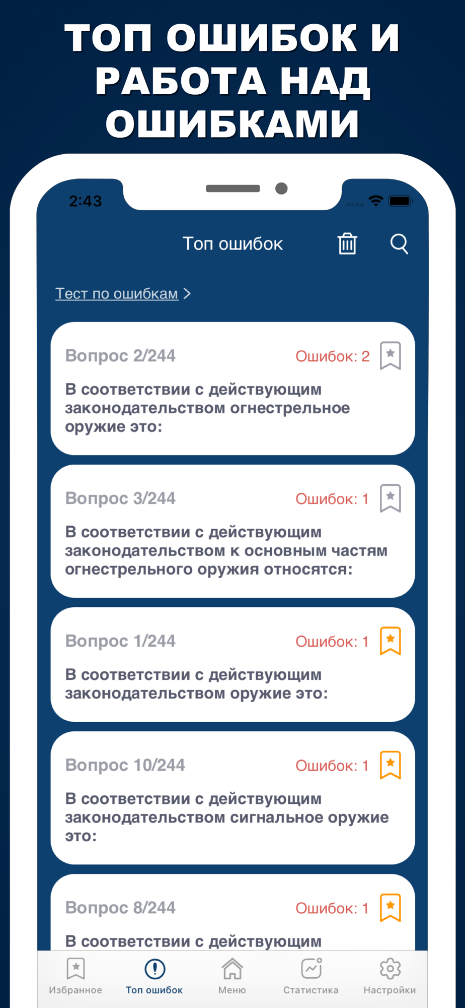 ► Избранное - можно добавлять вопросы в Избранное из всех трех режимов, а также из Топа ошибок.