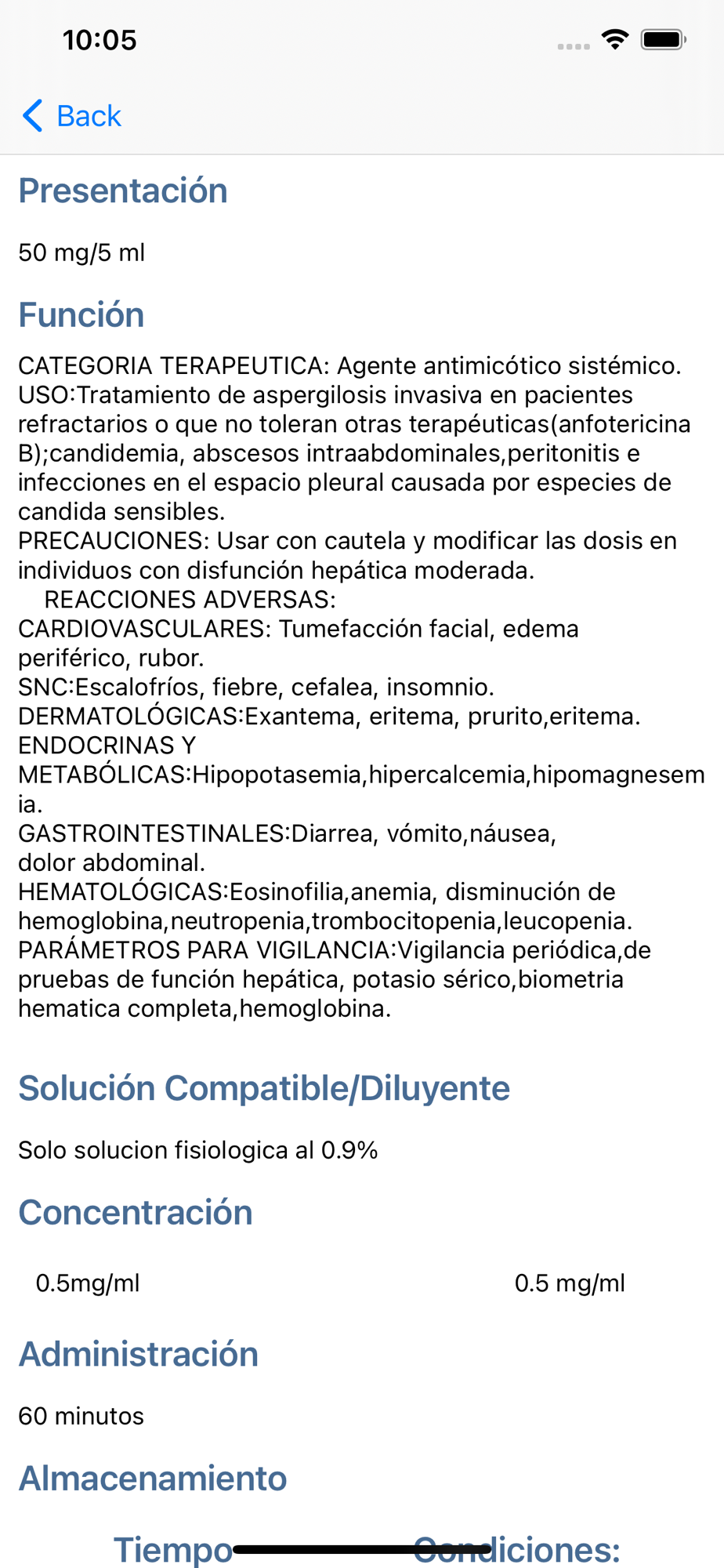 El contenido clínico con el que cuenta Manual Pediátrico es preciso y se actualiza con regularidad, los Profesionales podrán consultar obteniendo información veraz y detallada sobre los medicamentos. Cada medicamento contará con una amplia descripción y mostrará información como: Tipo de presentación, Función, Solución compatible, Concentración, Administración, Velocidad de infusión, Almacenamiento, Condiciones, etc. (editado)
