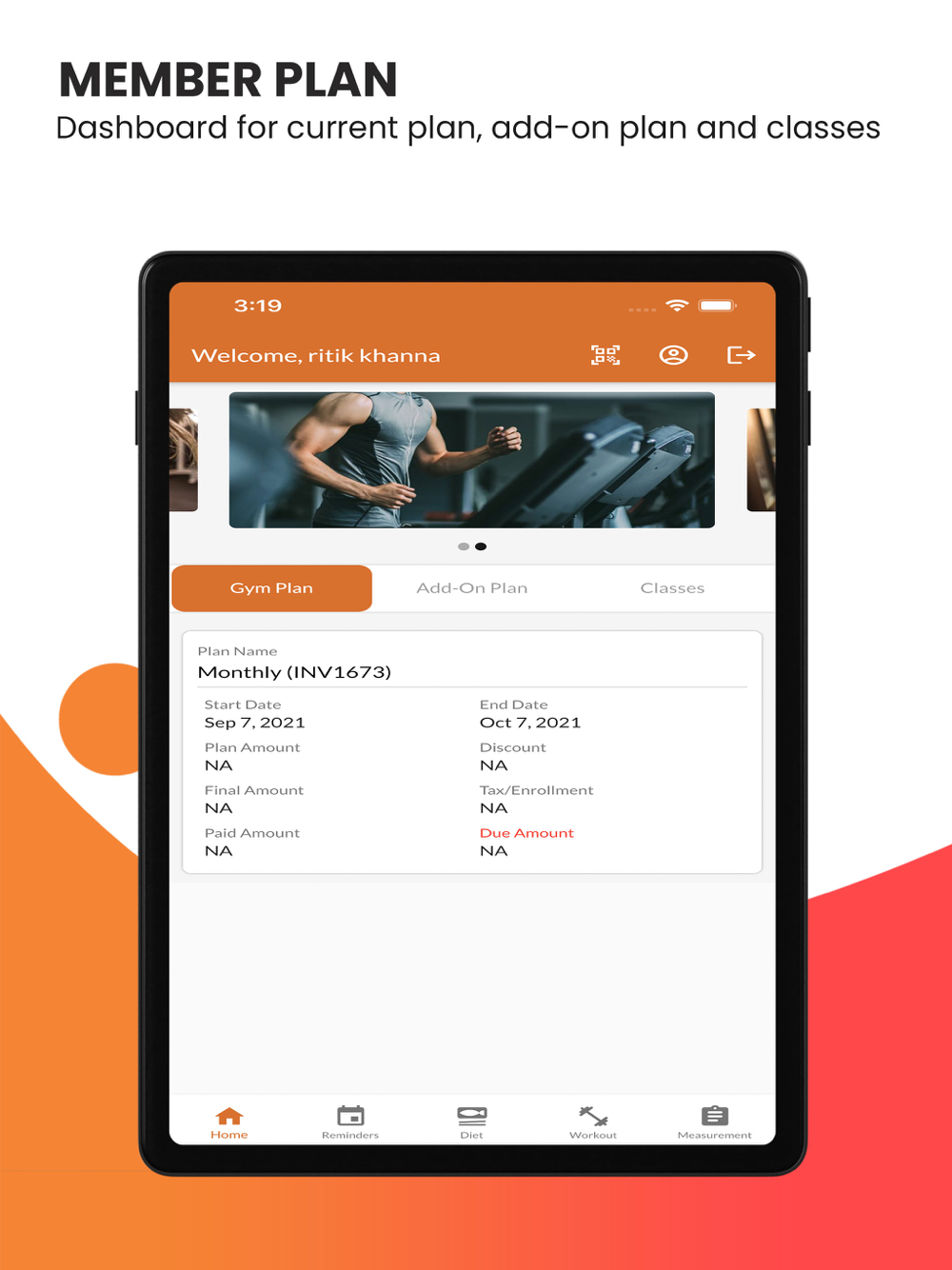 Exclusive gym app for Ginnys Gym members, Gym member can login to the app with login details provided by gym at the time of membership registration at gym branch. Members can find their plan details, their measurements, members can check their diet plan and exercise plans.