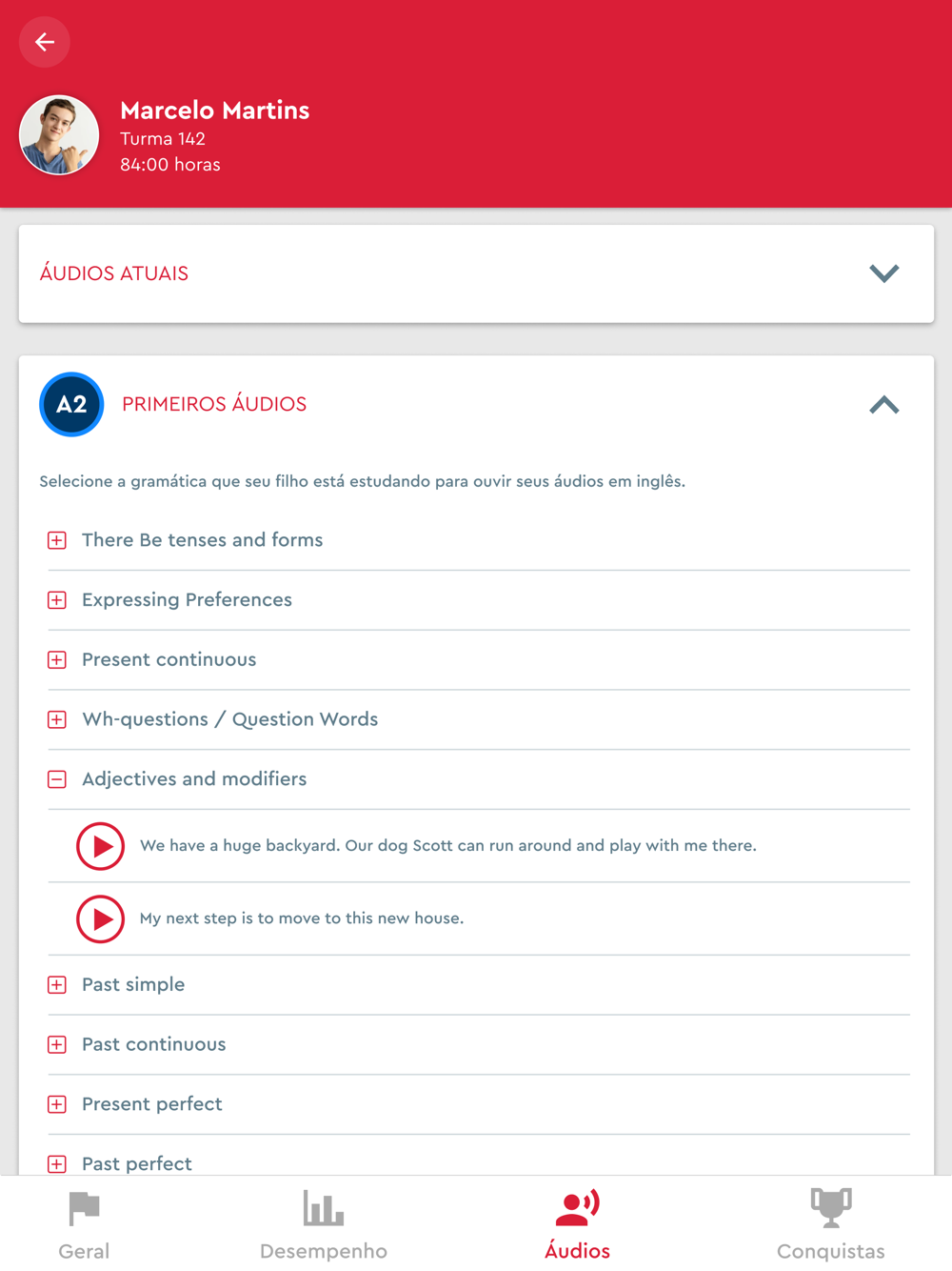 - Las conquistas de los alumnos¡Sepa lo que su hijo está estudiando en inglés y acompañe su progreso!